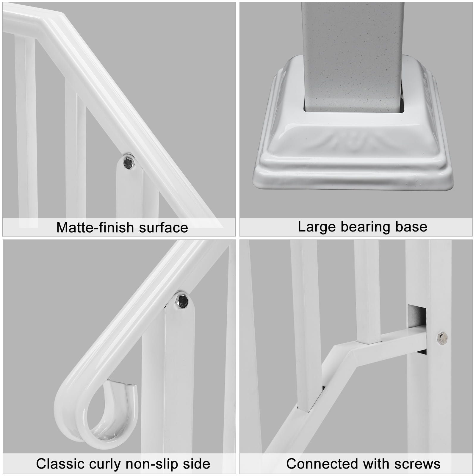 Zimtown Steps Handrail Staircase and Railing Handrails with Handrail Powder, Iron White, 11.24 lb Constructed with real wrought iron for enhanced reliability Stainless steel post mounts are resistant to rust and flexing Matte white powder coating provides a rustproof finish for durability and easy cleaning All connections are strongly welded for maximum stability Includes all necessary assembly and installation hardware Versatile design suitable for gardens, residential buildings, commercial offices, hotels, and more Ideal for garden steps, enhancing both safety and aesthetics