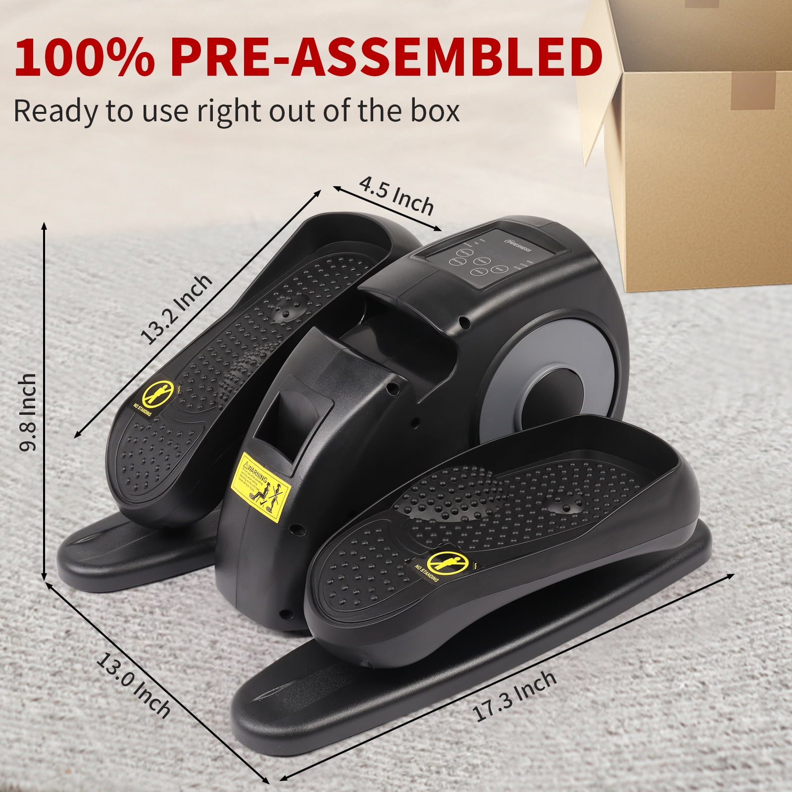 【POWERFUL FUNCTIONS】 The under desk elliptical offers versatile exercise modes tailored to your fitness goals: choose from adjustable Auto (P1-P5) and Manual (5-level speed) settings. The reversible pedals allow you to switch between forward and backward motions, targeting different muscle groups for a more comprehensive workout. 【SILENT RUNNING】 Equipped with ultra-smooth magnetic resistance, this mini desk elliptical significantly reduces friction noise, ensuring a quiet operation that won’t disturb others. Whether you’re reading a book or working, you can exercise without interruptions. 【EASY TO USE】 The intuitive LCD display clearly shows your progress, helping you monitor calories burned, distance covered, and workout duration. The machine can be used with or without power, offering flexibility in usage. 【DETAIL DESIGN】 Designed for convenience, the remote control allows you to adjust the speed and direction without bending down. A dedicated holder keeps the remote organized and within reach. The ergonomic recessed handle makes the elliptical easy to carry and store neatly. 【100% PREASSEMBLED】 Ready to use straight out of the box, the compact mini stepper measures 19.7 x 17.3 x 11.8 inches, fitting seamlessly into any limited space. Should you have any questions or concerns, simply contact us via email for prompt and satisfactory support.