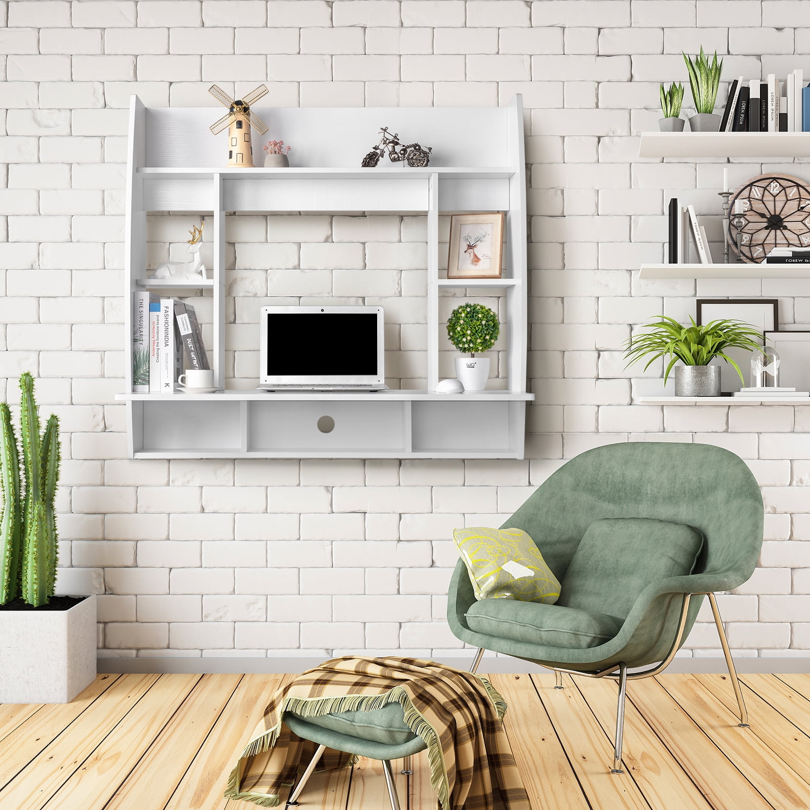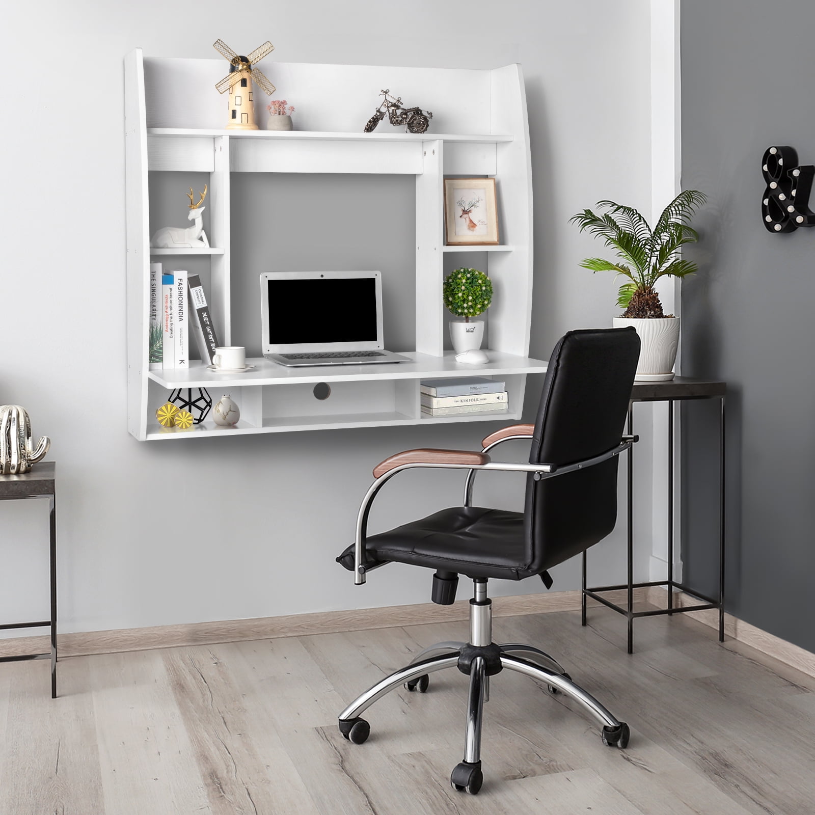 Flexible & Safe Wall-Mounted Design: Securely mounted with stable hangers, this exquisite room-saving floating desk is crafted from high-grade E1 15MM chipboard, ensuring durability and style. It won’t fall and allows height adjustment for your ideal workspace, with assembly tools included. Compact Design for Space Efficiency: Maximize floor space with this innovative wall-mounted desk, turning any wall into a stylish workspace solution—perfect for small areas like dorms or study rooms. Ample Storage for Essentials: This multifunctional writing desk features storage shelves and a shallow drawer to keep your essentials organized. Six open compartments are great for displaying knick-knacks. Sturdy & Durable Construction: Crafted from premium materials, this laptop desk supports daily use. The surface is waterproof and easy to clean, making it perfect for your everyday tasks. Sleek Design for Versatile Use: With a modern look, this computer desk fits any decor. Use it as a home office desk, vanity table, or storage solution in any room. Upgrade your space with this versatile floating desk!