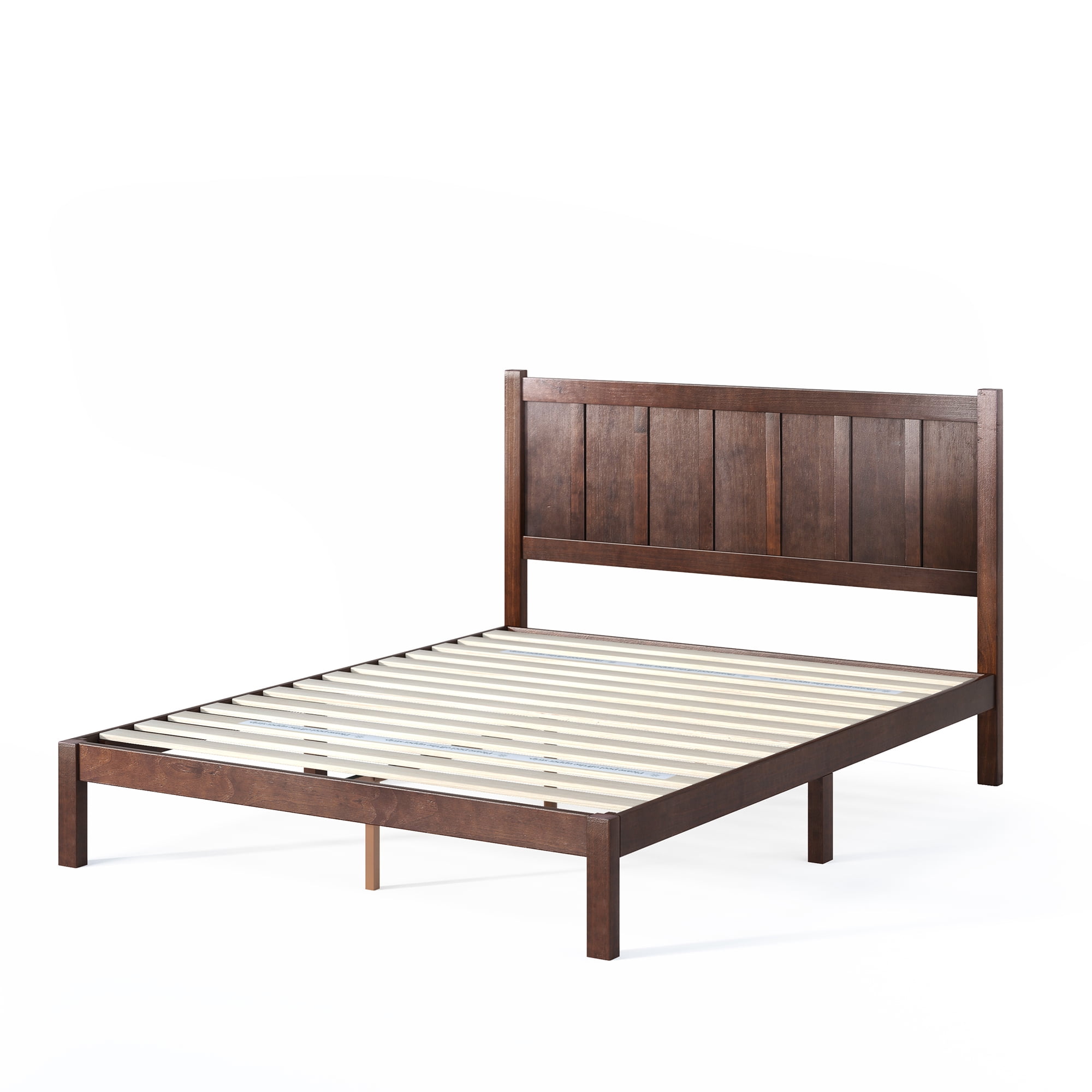 Zinus Adrian 42″ Acacia Wood Rustic Platform Bed Frame, Queen Easy to assemble and no box Spring needed Rustic wood paneled headboard Wood frame and strong wood slat mattress support for increased mattress life Foam padded tape is added to the steel frame for noise-free use and non-slip tape on the wooden slats prevents your mattress from moving Distance between wood slats is 3 inches for twin, full and 2.5 inches for Queen, King. Age Group: Adult, Universal. Worry free 5 year warranty See our assortment of Zinus products