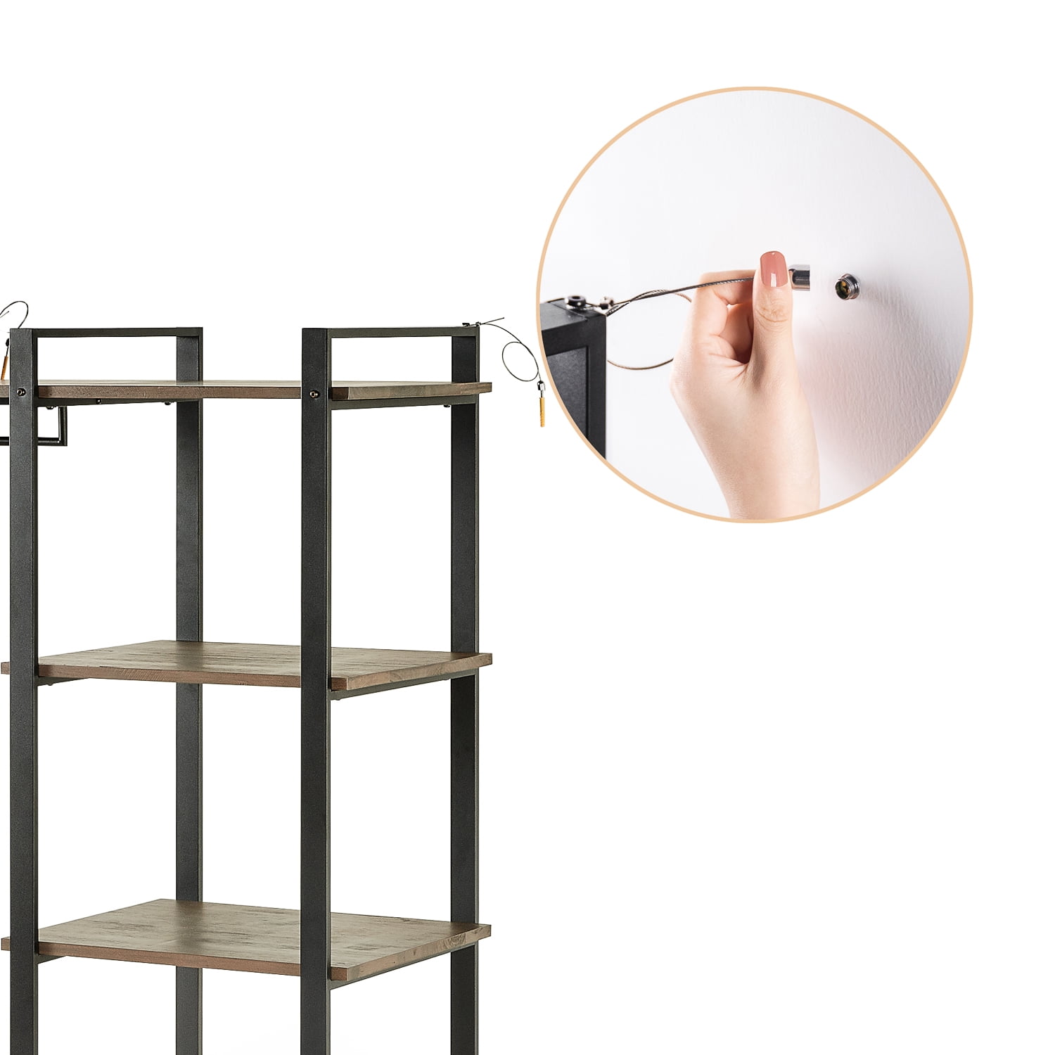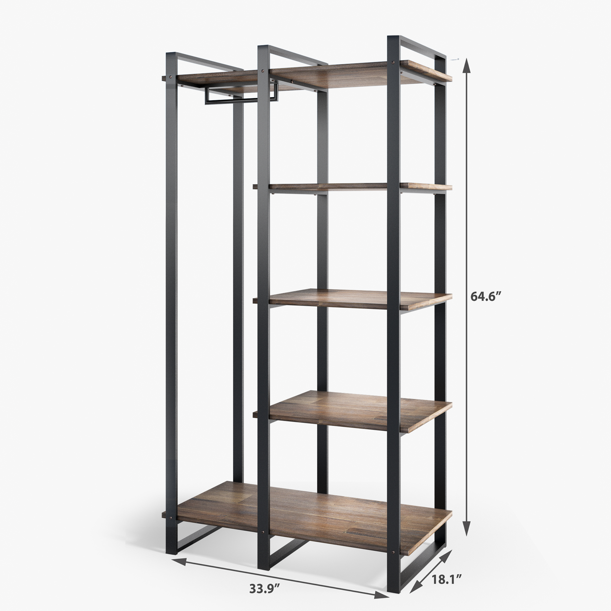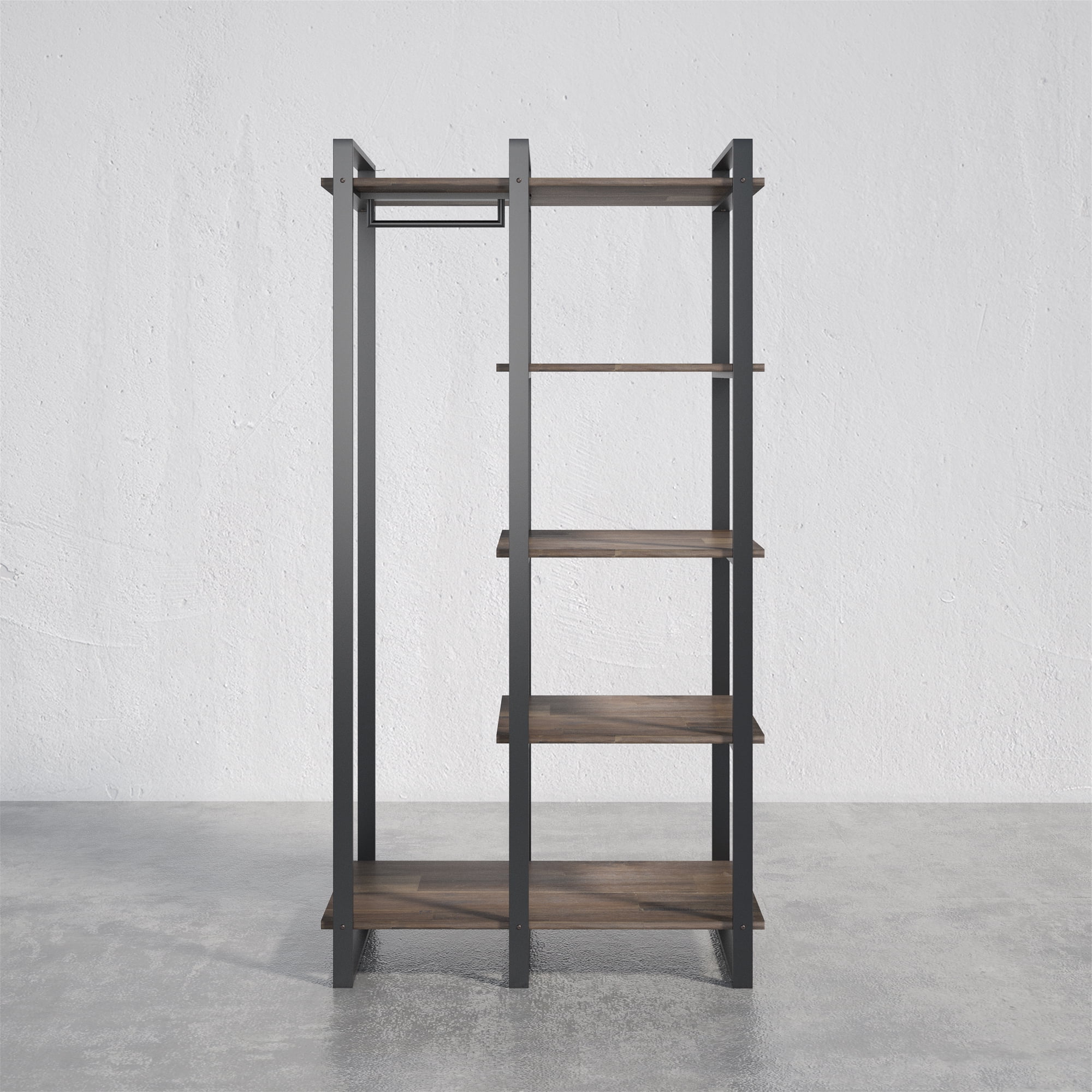 Zinus Brock 64″ Etagere Bookcase with Hanging Storage BEAUTIFULLY CRAFTED – Modern-industrial design features 100% solid acacia wood with striking natural woodgrain and metal frame with brass-finished accents VERSATILE & FUNCTIONAL – Four shelves and a heavy-duty hanging rod offer plenty of potential for storage and decoration alike STURDY DESIGN – Solid acacia wood and steel frame are durably designed and built to last; a wall anchor safety hooks included to prevent tipping EASY ASSEMBLY – All tools, parts and instructions are expertly packed into one box for simple assembly Worry free 1-year limited warranty