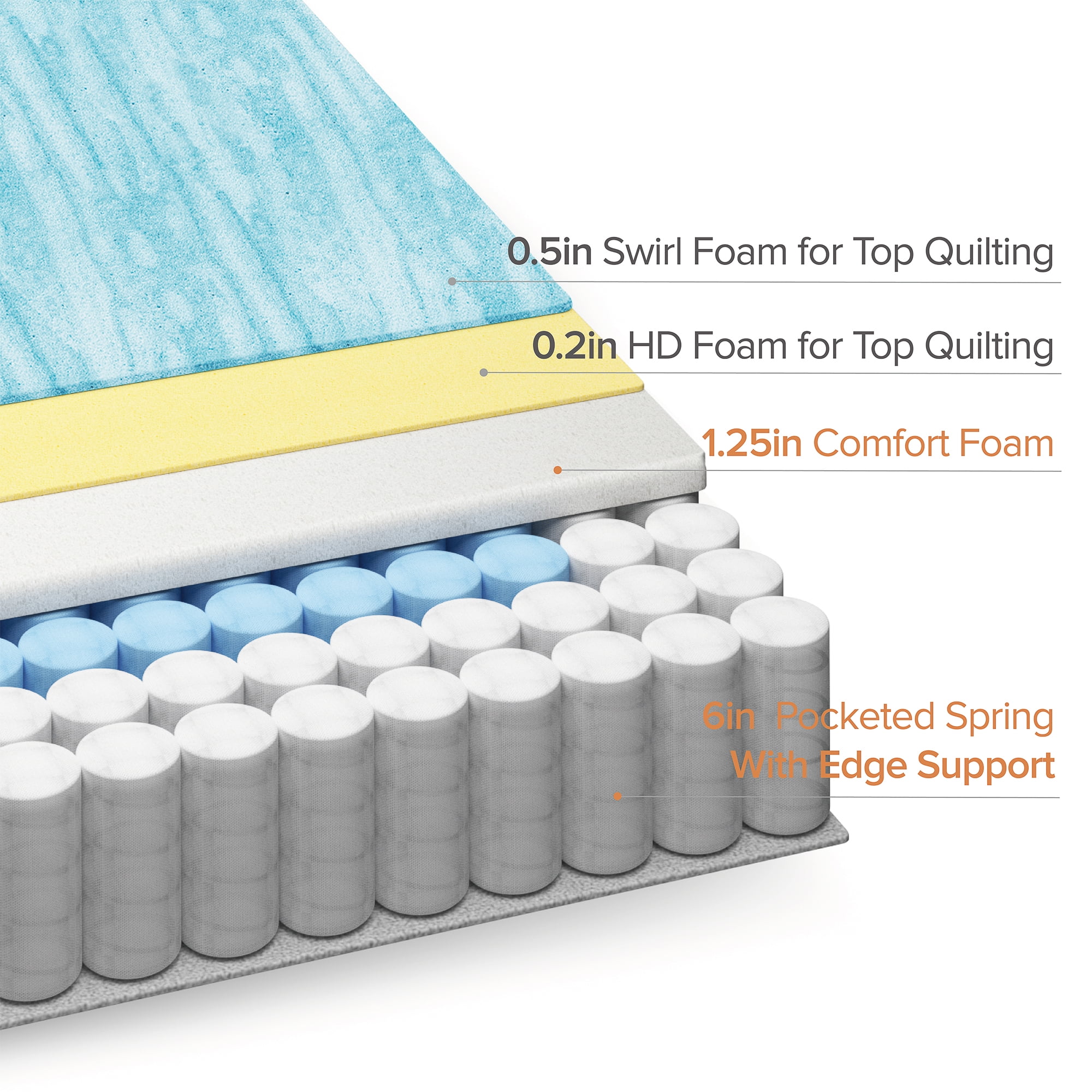 Zinus Cool Touch Comfort 8″ Hybrid of type of Gel Memory Foam and Pocket Spring Mattress, Queen CURL UP IN COOL COMFORT – Specially developed with swirled gel memory foam and a cool-to-the-touch AirCool cover, this one-of-a-kind hybrid offers you undisturbed, supportive rest and ultimate relief from hot sleeping PRESSURE RELIEVING LAYERS – Equipped with cool and enveloping gel memory foam, responsive comfort foam and steel pocket springs that respond independently to movement, providing dynamic pressure-relief and reduced motion transfer SUPERIOR EDGE SUPPORT – Our proven coil edge support system features a perimeter of extra durable steel coils that add stability and prevent sagging while sitting on the edge of the bed EXPERTLY PACKAGED – Our technology allows this mattress to be efficiently compressed into one box that’s easily shipped and maneuvered into the bedroom Simply unbox, unroll and this mattress does the rest, expanding to its original shape within 72 hours Swirl gel memory and comfort foams with steel pocket springs Twin mattress supports a maximum weight of 250 lbs, while all other sizes can support up to 500 lbs Worry-free 10 year limited warranty included See our assortment of Zinus products
