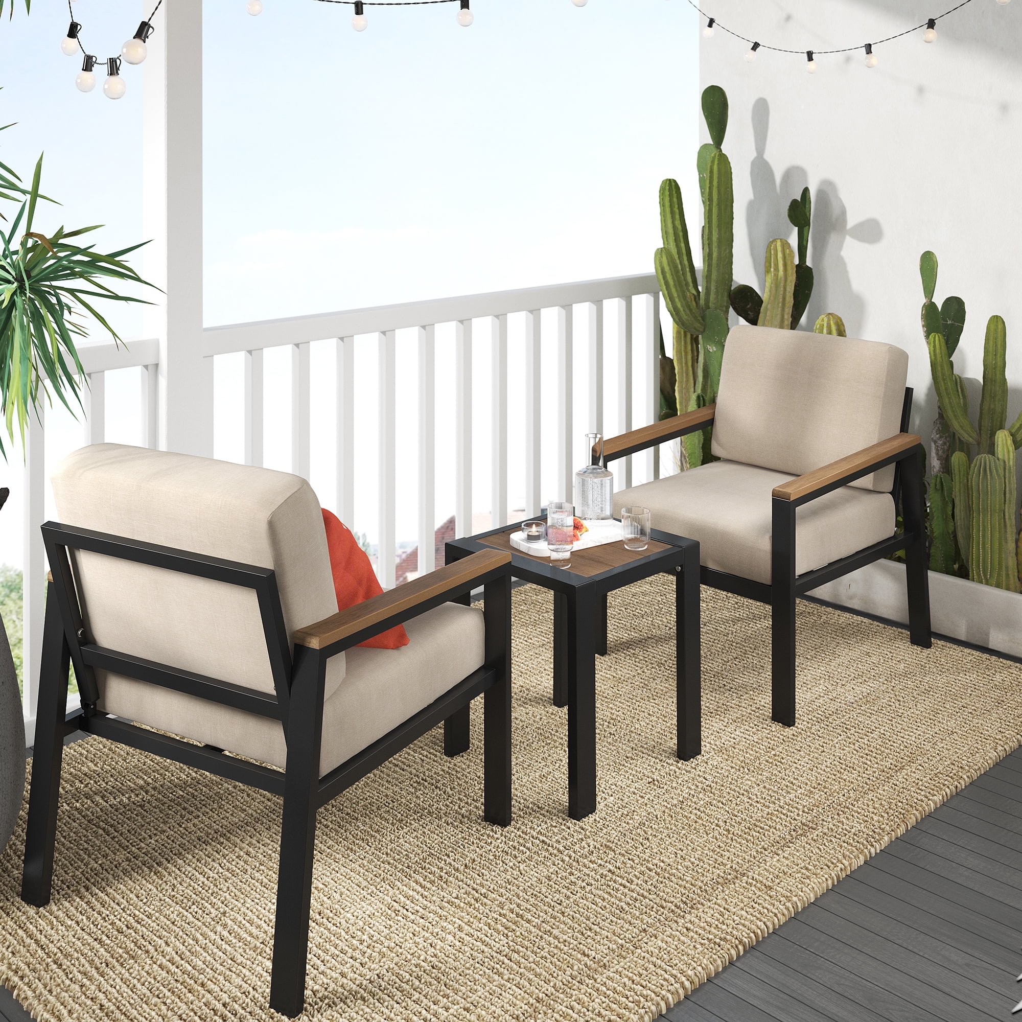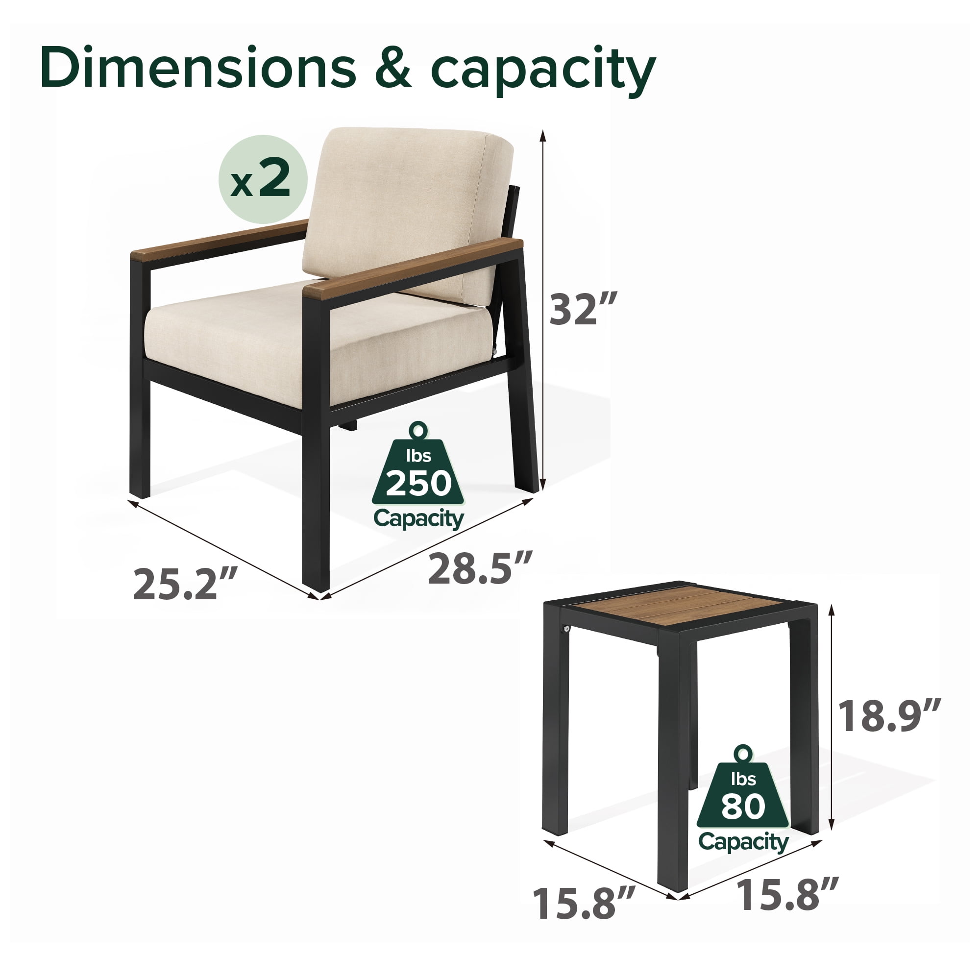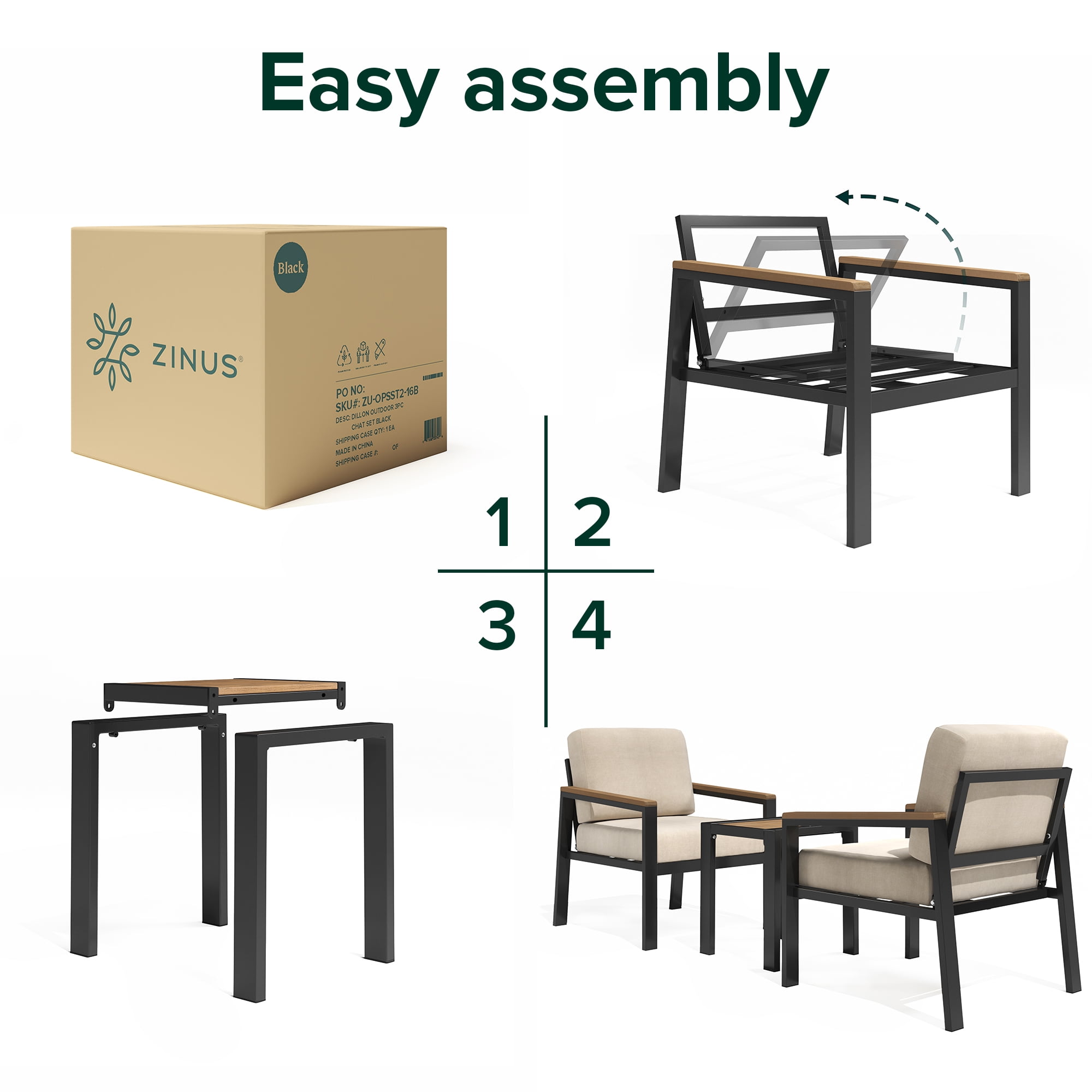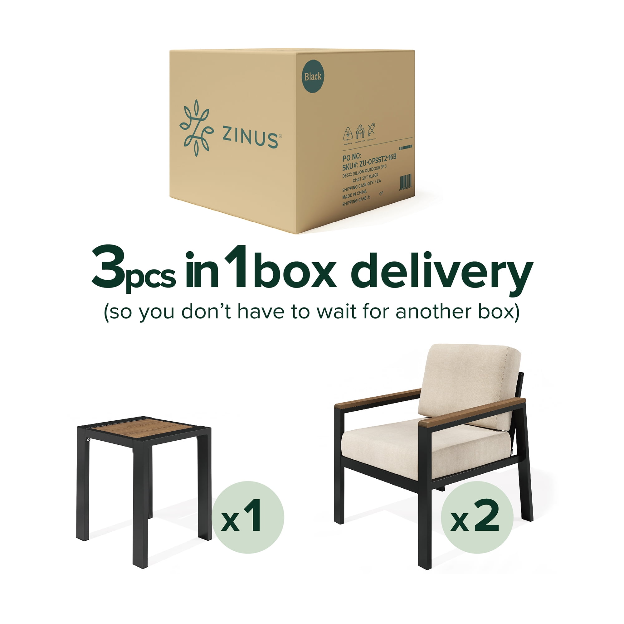 Zinus Dillon Aluminum and Poly Lumber Outdoor 3 Piece Chat Set, Black SMALL SPACE FRIENDLY PATIO SET – Create a functional outdoor gathering space with this 3-piece chat set, designed with contemporary styling for your small patio, balcony, or porch; armchairs measure 25.2” W x 28.5” D x 32” H and table measures 15.8” W x 15.8” D x 19” H WATERPROOF, RUST-PROOF, AND WATER-REPELLENT – Crafted with waterproof poly lumber, rust-proof aluminum, and water-repellent cushion covers to hold up beautifully over time DURABLE AND COMFORTABLE – Frames made of durable aluminum and poly lumber are lightweight yet ultra strong for everyday use, and fiber filled cushioning lets you sit supported for hours at a time SHIPPED IN A SINGLE BOX – This compact 3-piece set arrives in just one box with everything you need to assemble it in no time, so there’s no need to break out your toolbox 1 YEAR WARRANTY – A 1-year worry-free manufacturer’s warranty is included with your purchase See our assortment of Zinus products