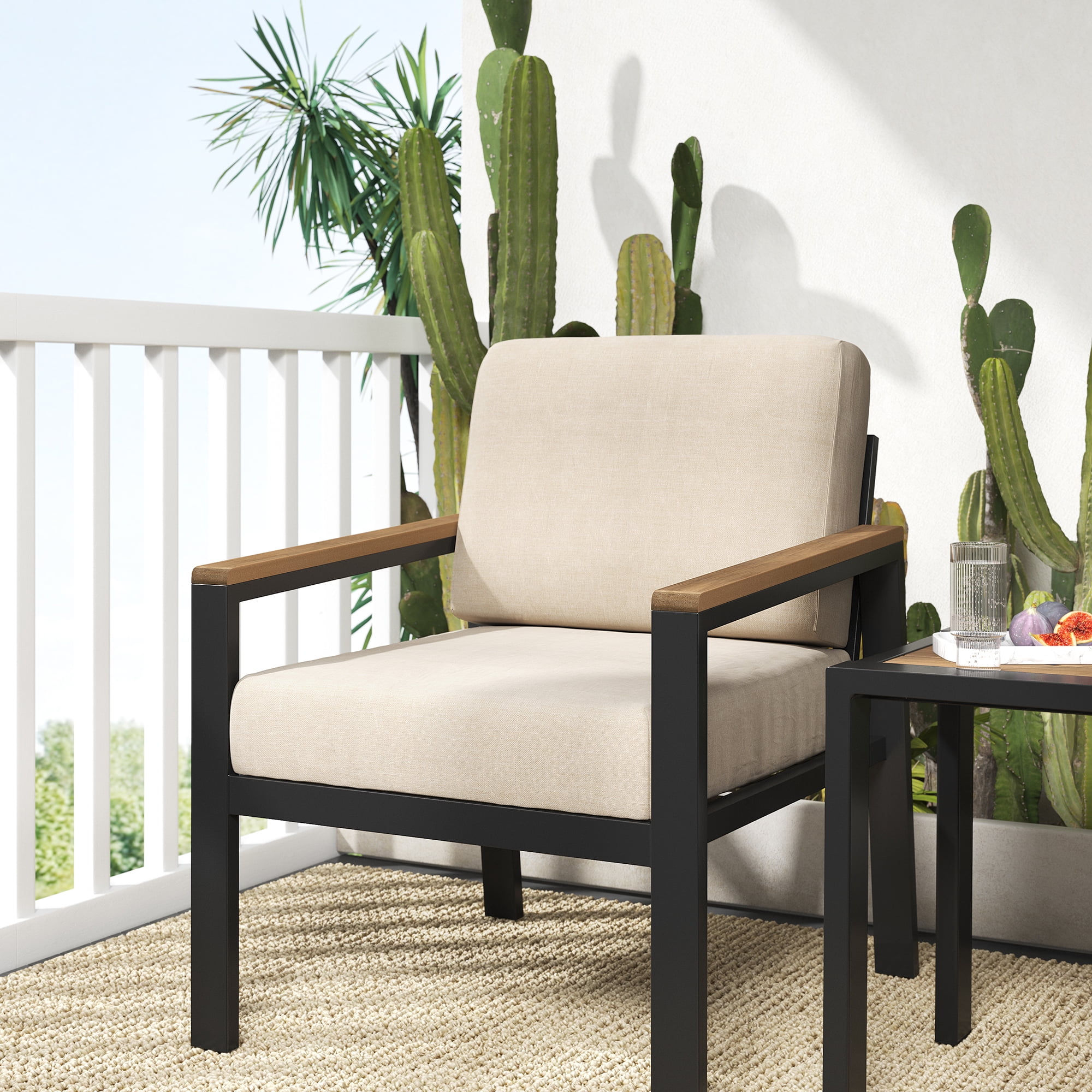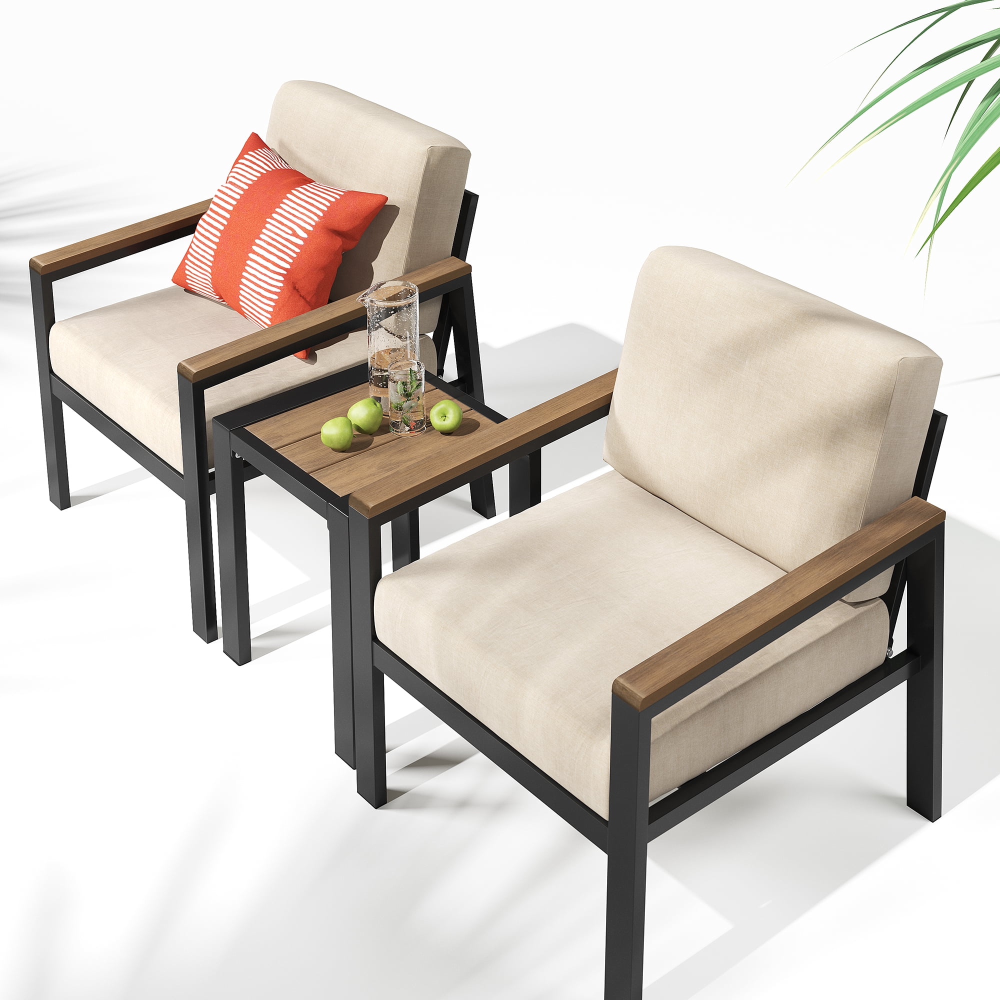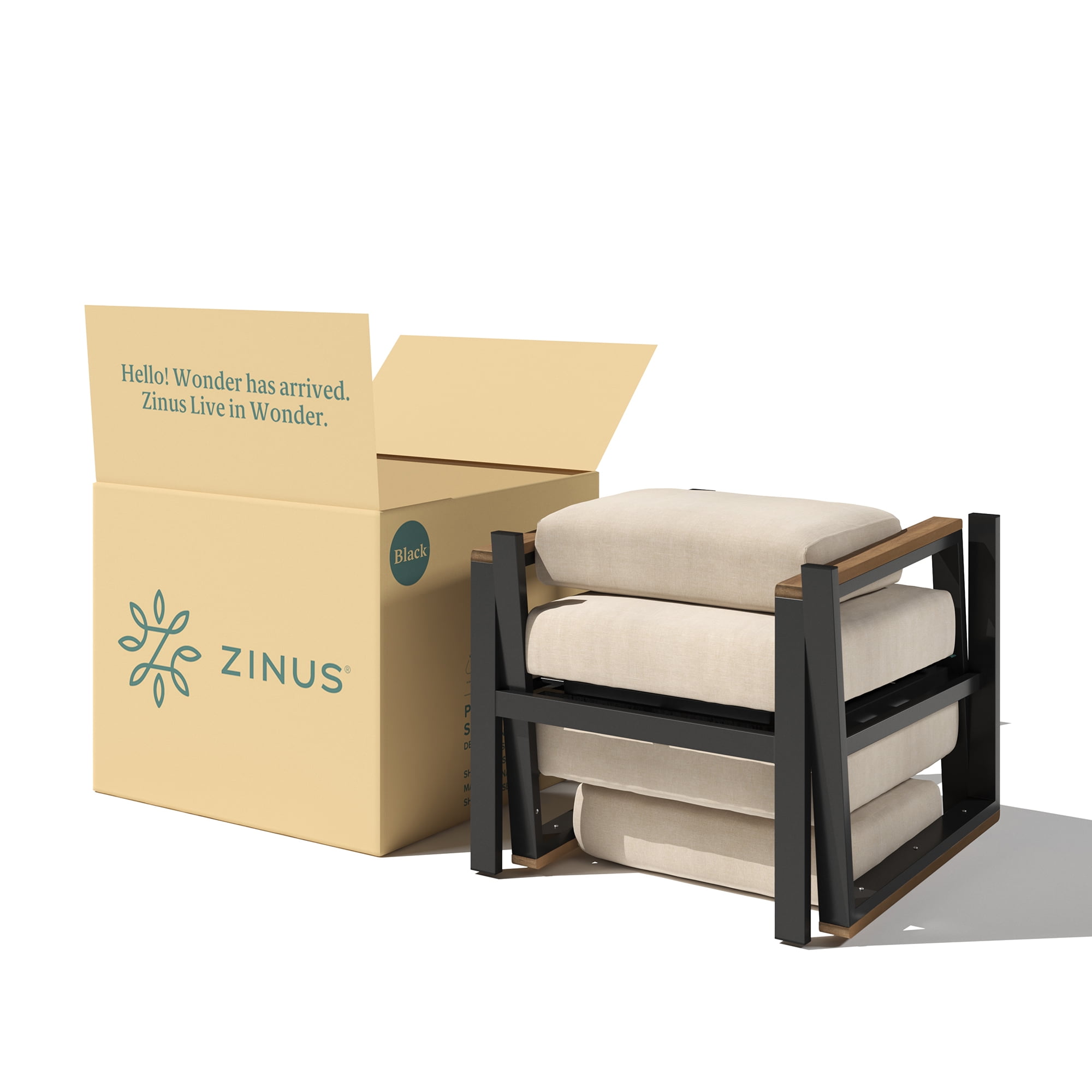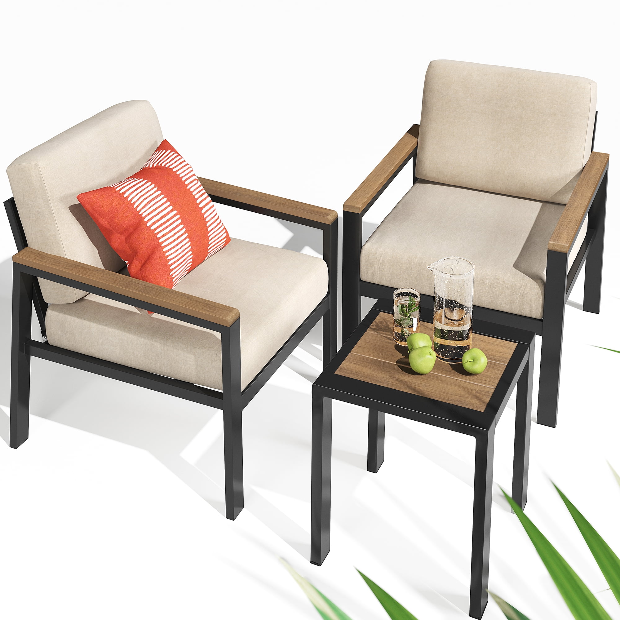 Zinus Dillon Aluminum and Poly Lumber Outdoor 3 Piece Chat Set, Black SMALL SPACE FRIENDLY PATIO SET – Create a functional outdoor gathering space with this 3-piece chat set, designed with contemporary styling for your small patio, balcony, or porch; armchairs measure 25.2” W x 28.5” D x 32” H and table measures 15.8” W x 15.8” D x 19” H WATERPROOF, RUST-PROOF, AND WATER-REPELLENT – Crafted with waterproof poly lumber, rust-proof aluminum, and water-repellent cushion covers to hold up beautifully over time DURABLE AND COMFORTABLE – Frames made of durable aluminum and poly lumber are lightweight yet ultra strong for everyday use, and fiber filled cushioning lets you sit supported for hours at a time SHIPPED IN A SINGLE BOX – This compact 3-piece set arrives in just one box with everything you need to assemble it in no time, so there’s no need to break out your toolbox 1 YEAR WARRANTY – A 1-year worry-free manufacturer’s warranty is included with your purchase See our assortment of Zinus products