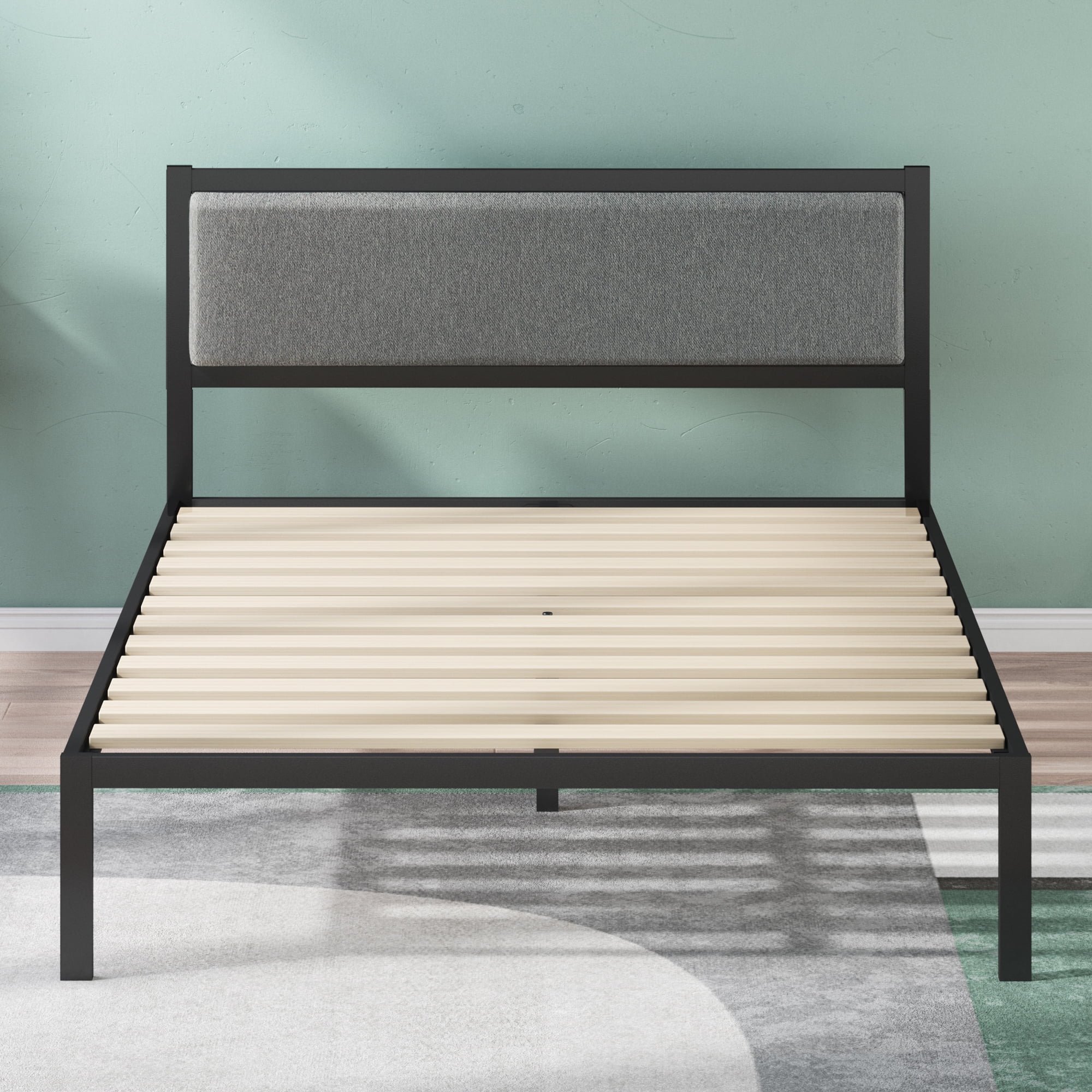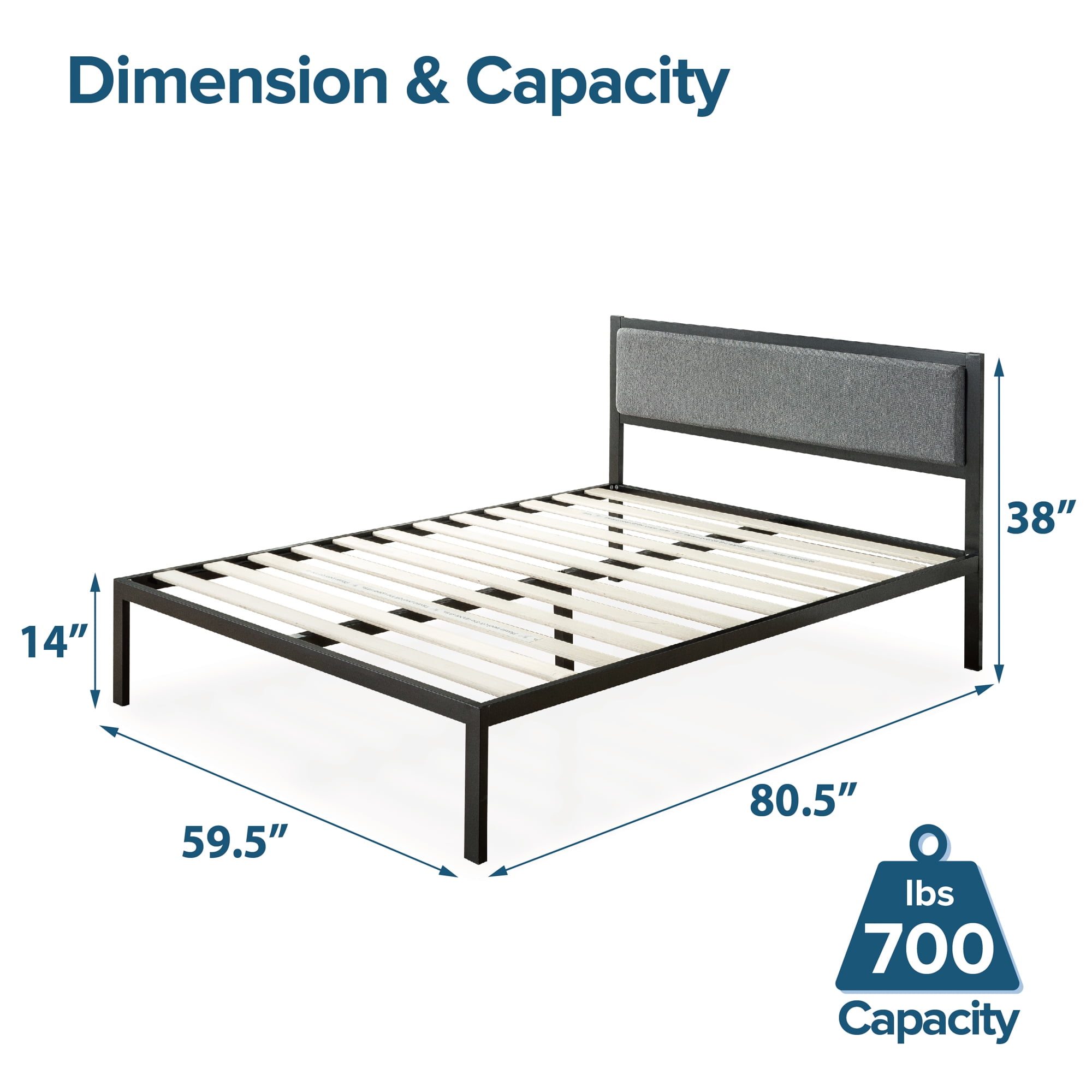 Zinus Korey 38″ Metal Platform Bed with Upholstered Headboard, Queen Grey foam cushioned upholstered headboard Made entirely of steel framework, the durable foundation will support many years of serious snoozing; twin size supports a maximum weight capacity of 350 lbs, while all other sizes can support up to 700 lbs Reliable wood slats are designed to support your latex, memory foam or spring mattress without a box spring All parts, tools and instructions are shipped straight to your door in one efficiently packed box for simple set-up that takes less than an hour Worry-free 5 year limited warranty included; mattress sold separately Age Group: Adult, Universal. See our assortment of Zinus products