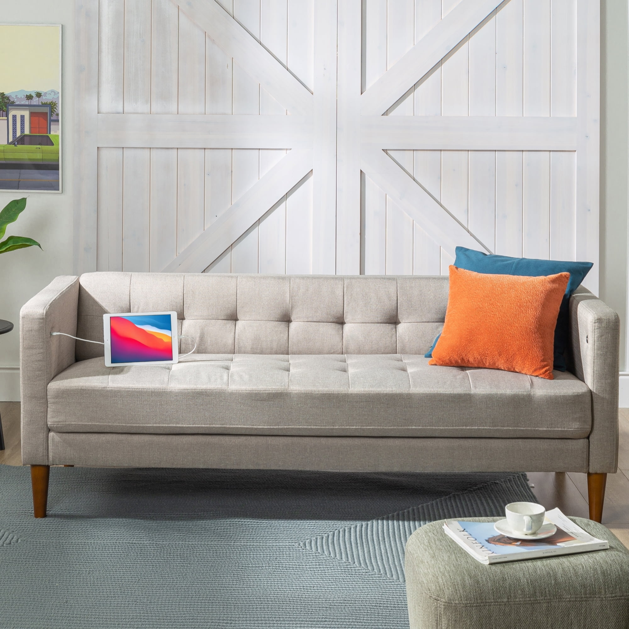 A sofa with relaxing comfort, elegant style and handy USB ports? Say hello to our one-of-a-kind indoor Pascal Sofa, a mid-century piece perfect for your living room upgrade. With its tufted foam cushions, sturdy frame and neutral oatmeal color, it’s an effortless choice for your living area or office. The USB ports on the inside of both sofa arms let you keep your devices plugged in, so no need to get up from relaxing and lounging. And this gorgeous couch only takes a few minutes to unbox and assemble with absolutely no tools required. This delightful three-seater comes right to your door in one box with everything you need- no hassle necessary. And it even includes a 1-year warranty as an added bonus. With Pascal, you can expect nothing less than a supportive seat with a luxurious look and unbeatable quality. Age group: adult.