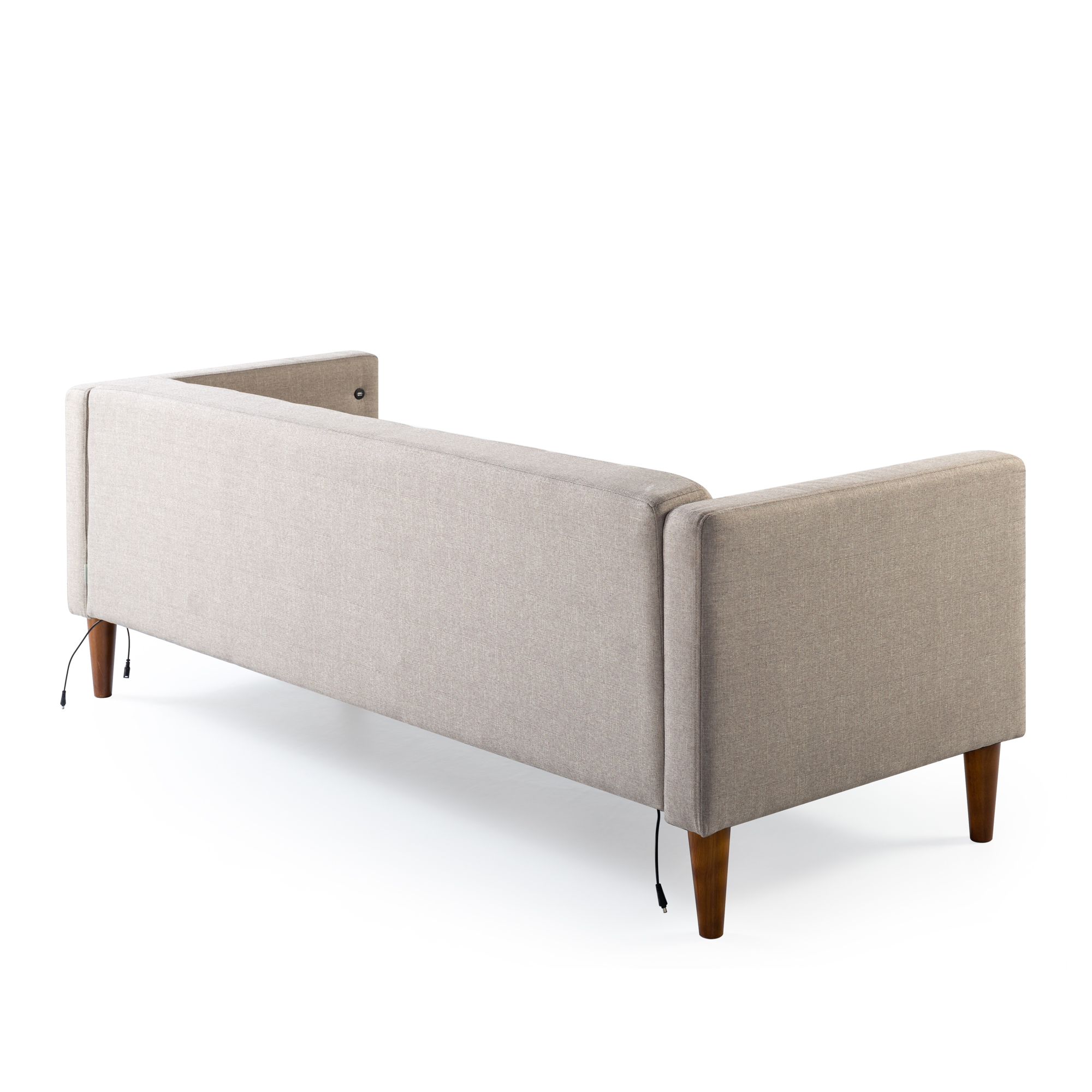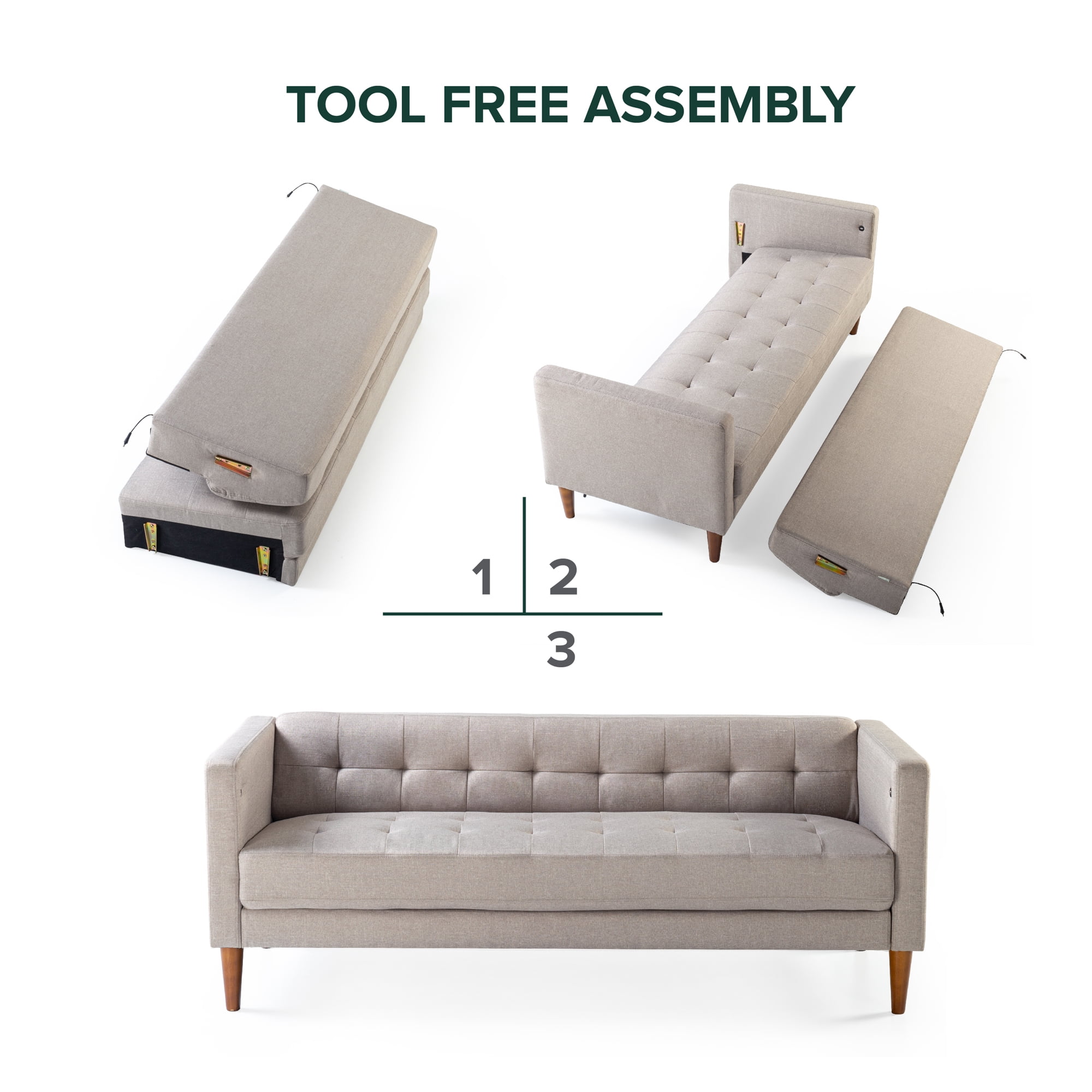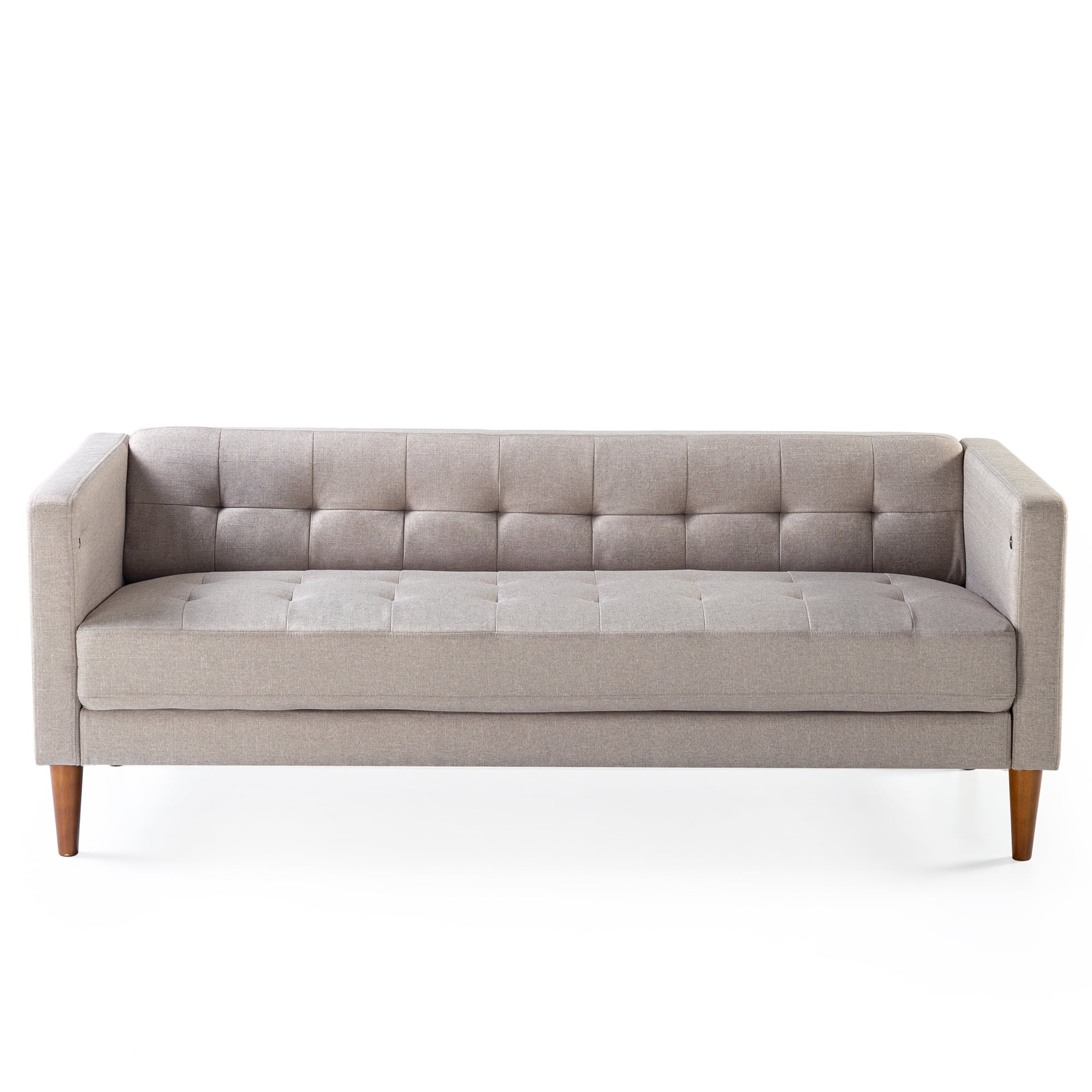 Zinus Pascal Indoor Sofa with USB Ports, Oatmeal: SOPHISTICATED STYLE MEETS SIMPLE SETUP – Sit pretty and comfortably atop this mid-century inspired sofa, complete with grid tufting and wood tapered legs, all conveniently assembled and ready for couching it in record time CHARGED UP – Two USB ports on either arm of this sofa with securely bundled cords underneath let you keep your devices fully charged right at your side BUILT TO LAST – A naturally strong frame is wrapped in supportive foam cushioning and durable woven fabric; seats a maximum weight capacity of 750 lbs.; all cushions are secured to the frame and are not detachable TOOL FREE ASSEMBLY – All parts and instructions are cleverly packed into one box for easy assembly in less than 20 minutes EASY CARE – Cushions are easily cleaned with a clean, damp cloth and mild detergent; cushion covers are not removable Age group: Adult.