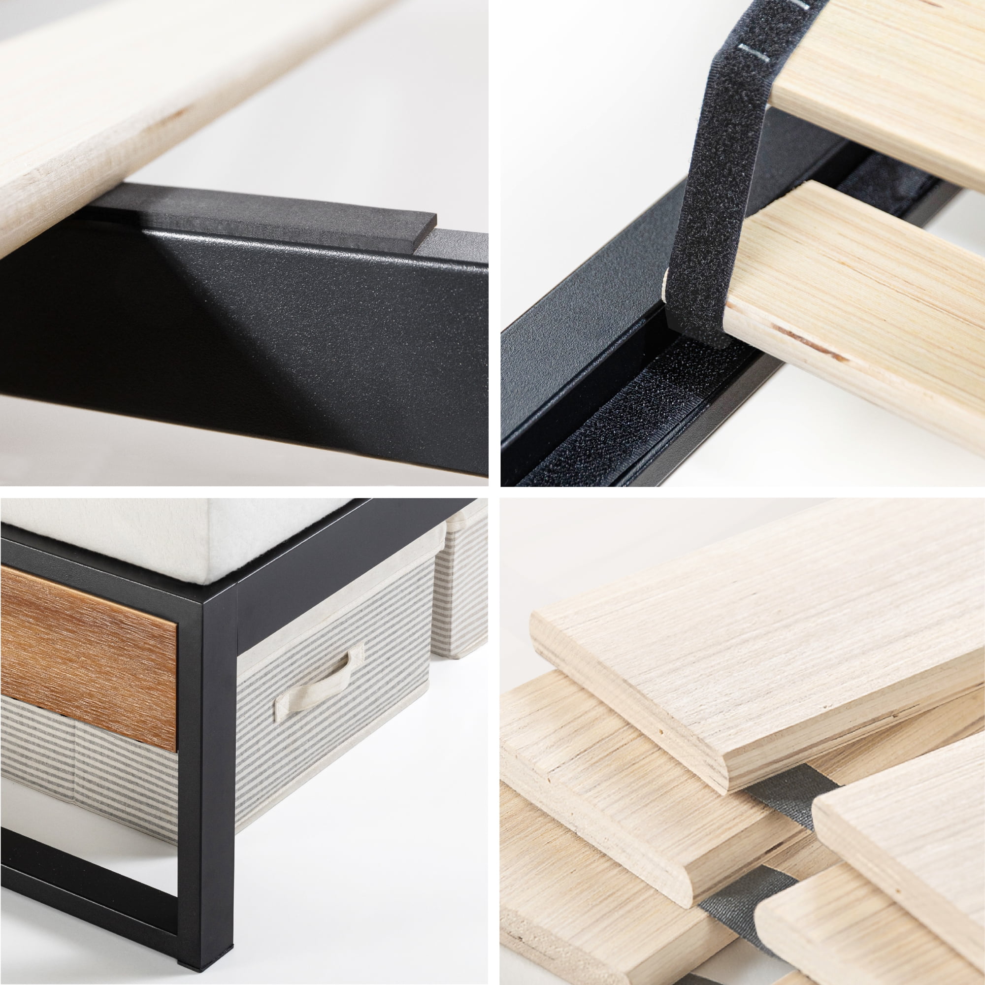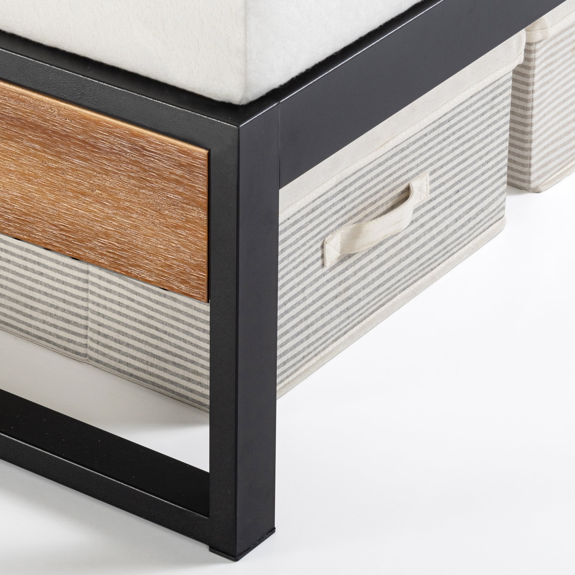 Set your bedroom to stun with the gorgeous craftsmanship of our high-quality Suzanne Metal and Wood Platform Bed. Solidly built and oh-so attractive, this inviting foundation is made from top-notch materials like genuine, solid wood and a strong, tubular steel base. The use of genuine wood delivers a one-of-a-kind, natural wood grain pattern that’s beautifully balanced with distinct, black painted metal framework. Plus, it features the outstanding mattress support of wide, closely spaced wooden slats that help extend the life of your mattress without ever needing a box spring. We’ve also added non-slip tape to the platform that prevents squeaking while also helping to keep your mattress in place. And when we say strong, we mean it. Full, queen and king sizes are built to effortlessly support up to 700 lbs, meaning the kids and the dog can join you in bed with no problem. It’s designed to be as simple to set up as it is stylish, which is why we pack it with all the tools and step-by-step instructions needed for painless assembly. Also included? A 5-year warranty against any defects in workmanship or materials. So whether you’re catching zzz’s or just enjoying the view, the expertly crafted Zinus Suzanne is made to get the job done. Age Group: Adult, Universal.