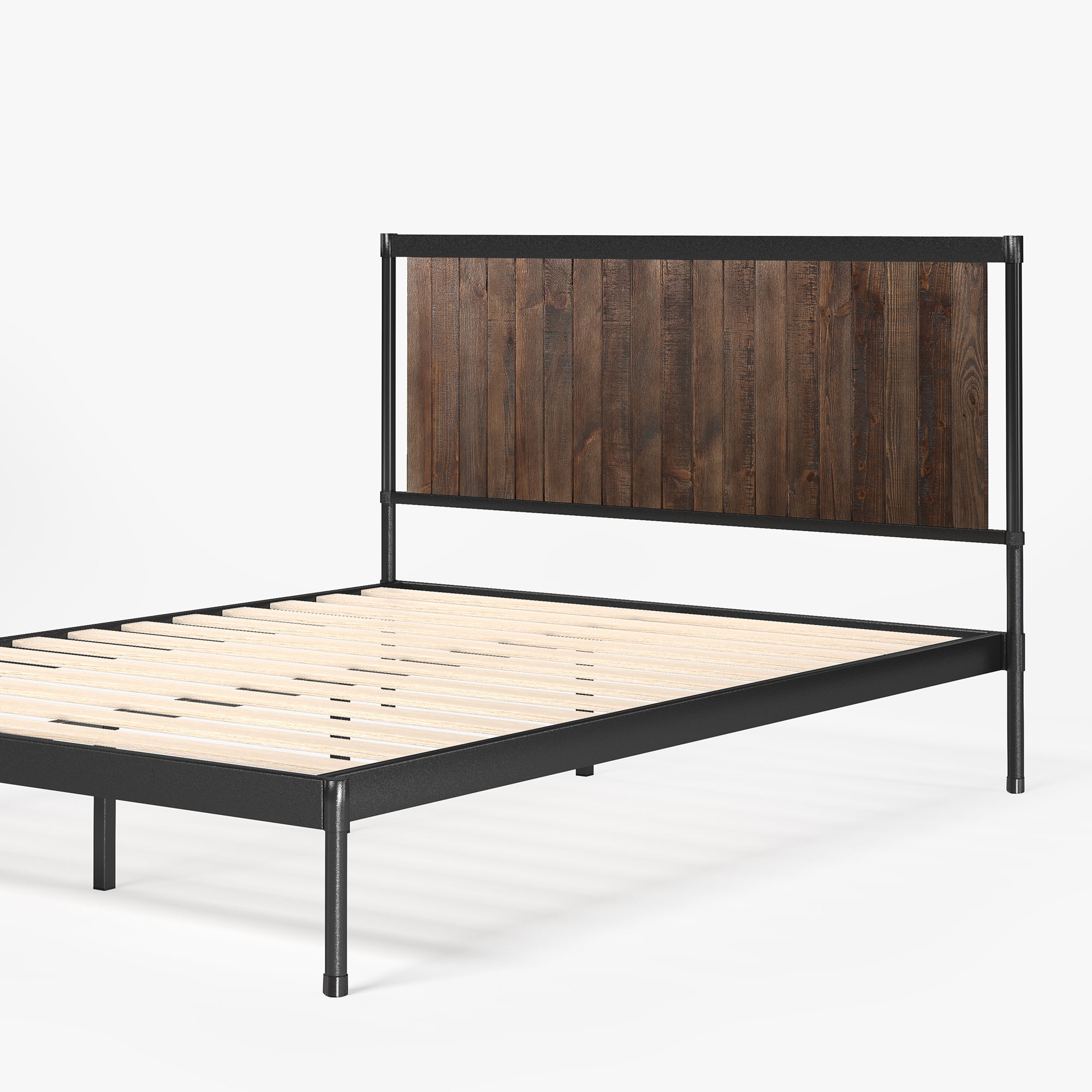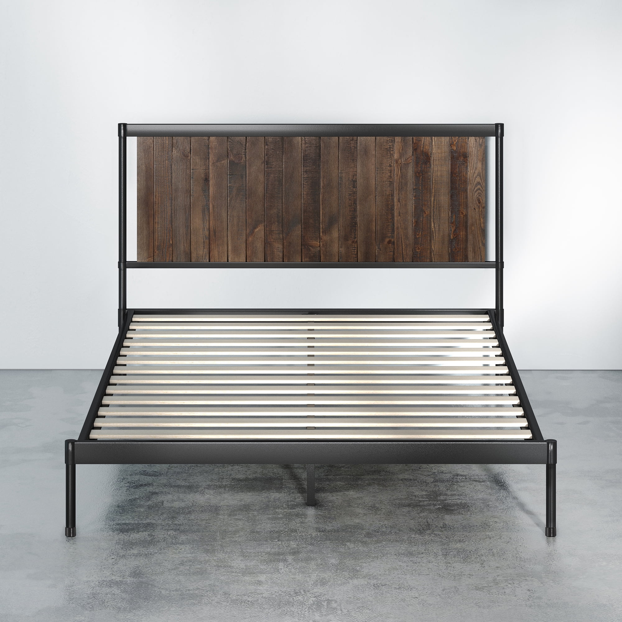 Zinus Wesley 42″ Metal Platform Bed Frame, Queen BEAUTIFULLY CRAFTED – Modern-industrial design features striking wood grain on a paneled headboard with rounded metal framework STURDY DESIGN – Steel framework is durably designed and built to last NO BOX SPRING NEEDED – Durable wood slats support and extend the life of your latex, memory foam or spring mattress without the need for a box spring; slats are spaced 2.6 inches apart; twin size supports a maximum weight capacity of 350 lbs, while all other sizes can support up to 700 lbs UNDERBED CLEARANCE SPACE – A 12 inch platform features 9.25 inches of clearance space perfect for storing odds and ends beneath the bed EASY ASSEMBLY – All tools, parts and instructions are expertly packed into one box for simple assembly in under an hour. Worry-free 5 year warranty included. Mattress sold separately Product dimensions 79.5″ x 59.5″, weight 87.21 lbs. FBOWNM-12Q