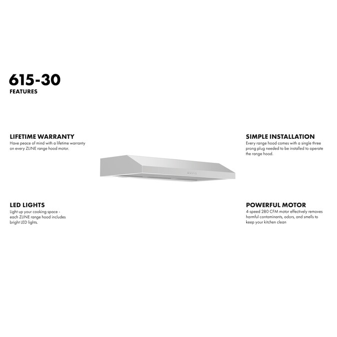 Experience ZLINE Attainable Luxury with kitchen and bath products that provide an elevated luxury experience, all designed in Lake Tahoe, USA. The ZLINE 615-30 is a 30 in. professional under cabinet stainless steel range hood with a modern design and built-to-last quality, making it a great addition to any kitchen. This hood’s high-performance, 280 CFM 3-speed motor will provide all the power you need to quietly and efficiently ventilate your stove while cooking. With its classic 430 grade stainless steel, this range hood contains rust, temperature, and corrosion-resistant properties to ensure a durable vent hood that will last for years to come. Enjoy modern features, including built-in LED lighting for an illuminated culinary experience and dishwasher-safe stainless steel baffle filters for easy clean-up. This wall mount range hood has a ducted vent with easy, simple installation. ZLINE Kitchen and Bath stands by all products with its manufacturer parts warranty. The 615-30 ships next business day when in stock.