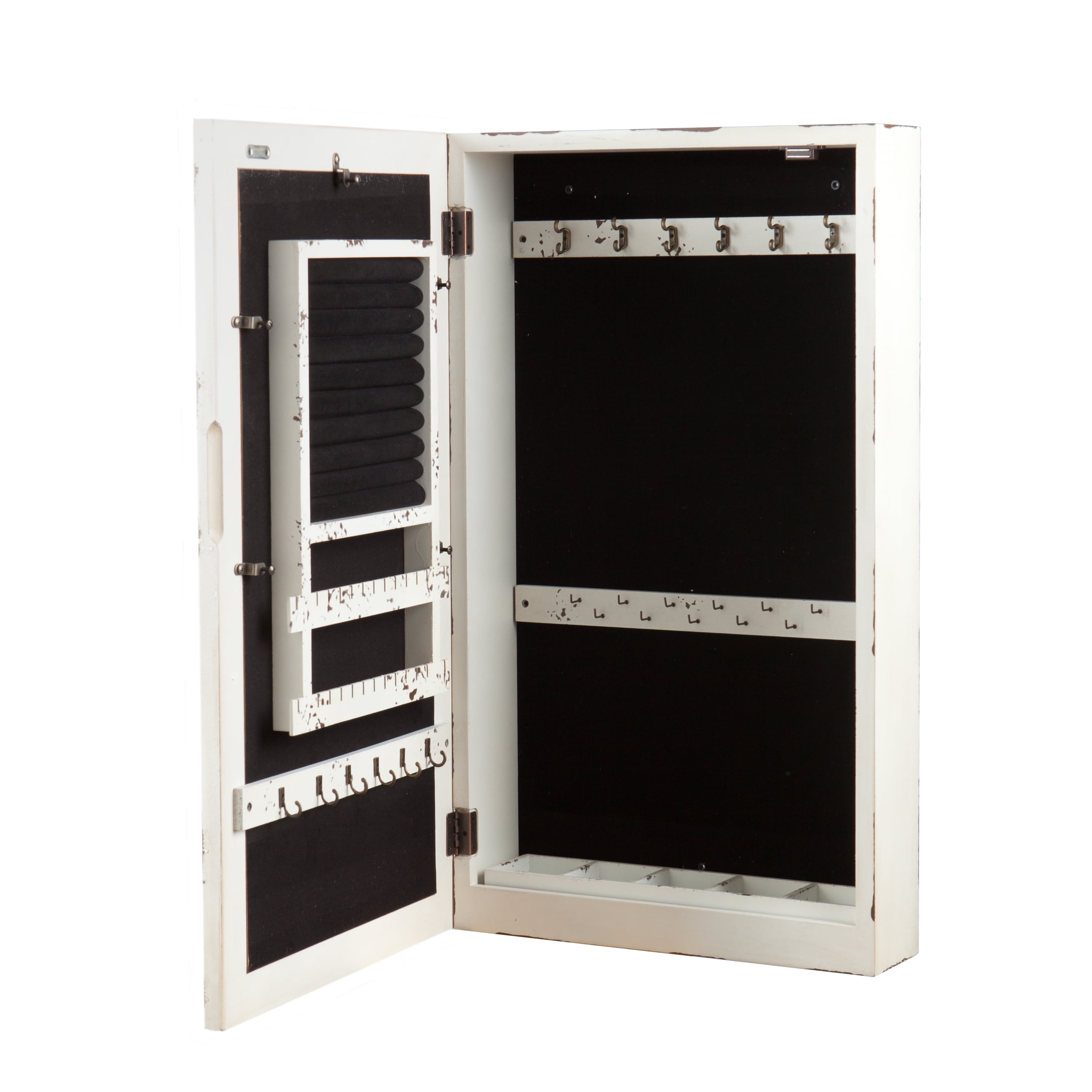 Keep valuables organized while showcasing your chic sense of style with this beautiful wall mount jewelry mirror. This distressed antique white finish and distinctive, cutout overlay on the mirror create a lovely vintage design. Neutral finish ensures your design stands out while blending in. Black felt lines the inside to protect jewelry against scuffs and scratches. Also, features a magnetic closure to keep your valuables tucked in securely. This week-designed jewelry mirror will be a beautiful addition to the bedroom, wall-in closet, bathroom, or entryway. From our family-owned company to your unique living space, SEI delivers a wide selection of quality furniture and home décor to complement your one-of-a-kind style. Orders received before 3pm local distribution center time for in stock items ship same business day.