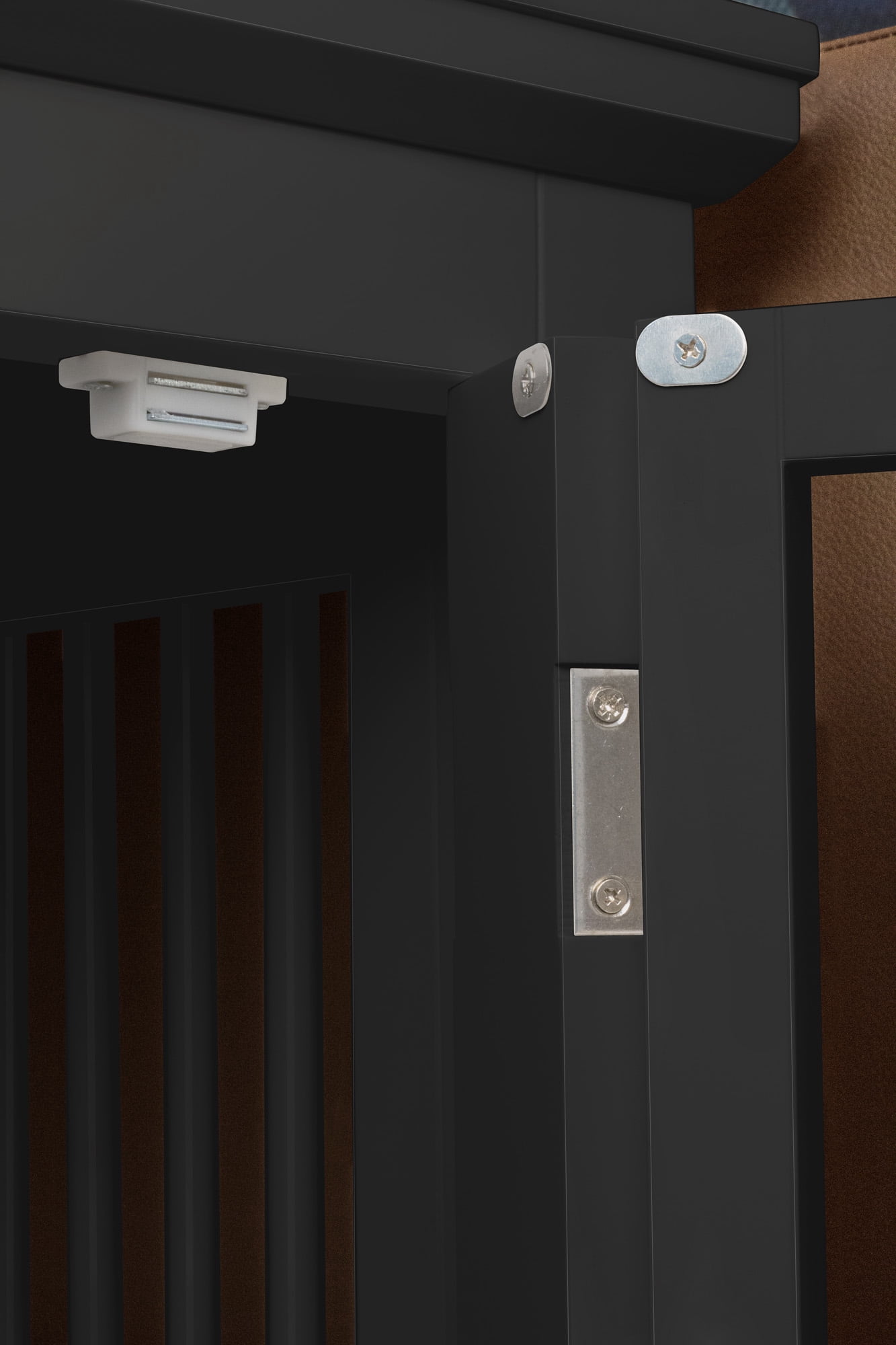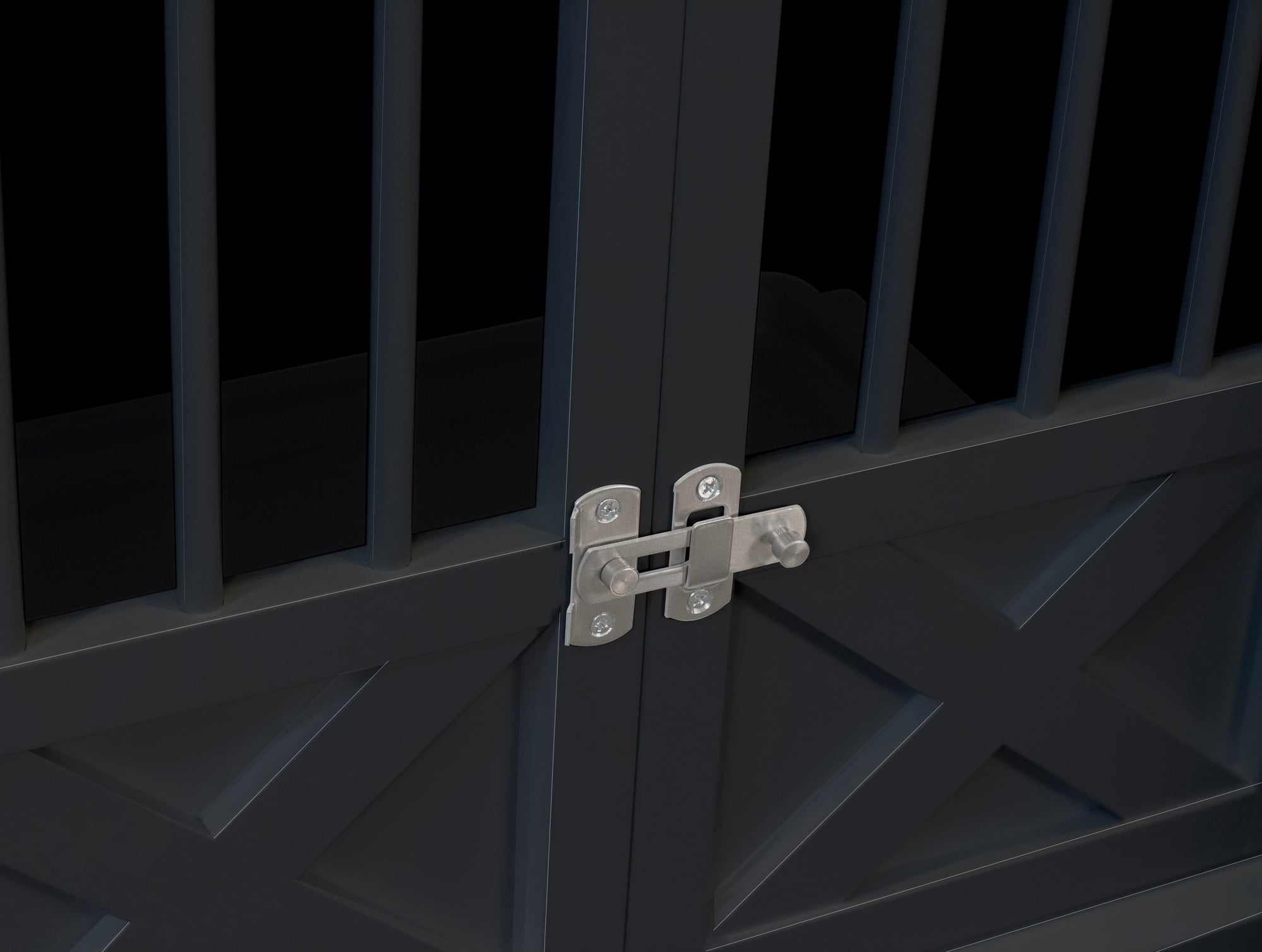Triple Door Dog Crate, Black, Medium: Easy assembly; hardware included The removable tray offers easy cleaning Double hinged front doors Includes 3 doors for convenient access; 2 front doors and 1 side door For indoor use Slats on 3 sides for visibility Top adds table space Slide and lift door latches Medium dog crate coordinates with other furnishings Dimensions: 30.63″ x 20.39″ x 23.23″ Sturdy wood and engineered wood construction End-table-style crate coordinates with your space