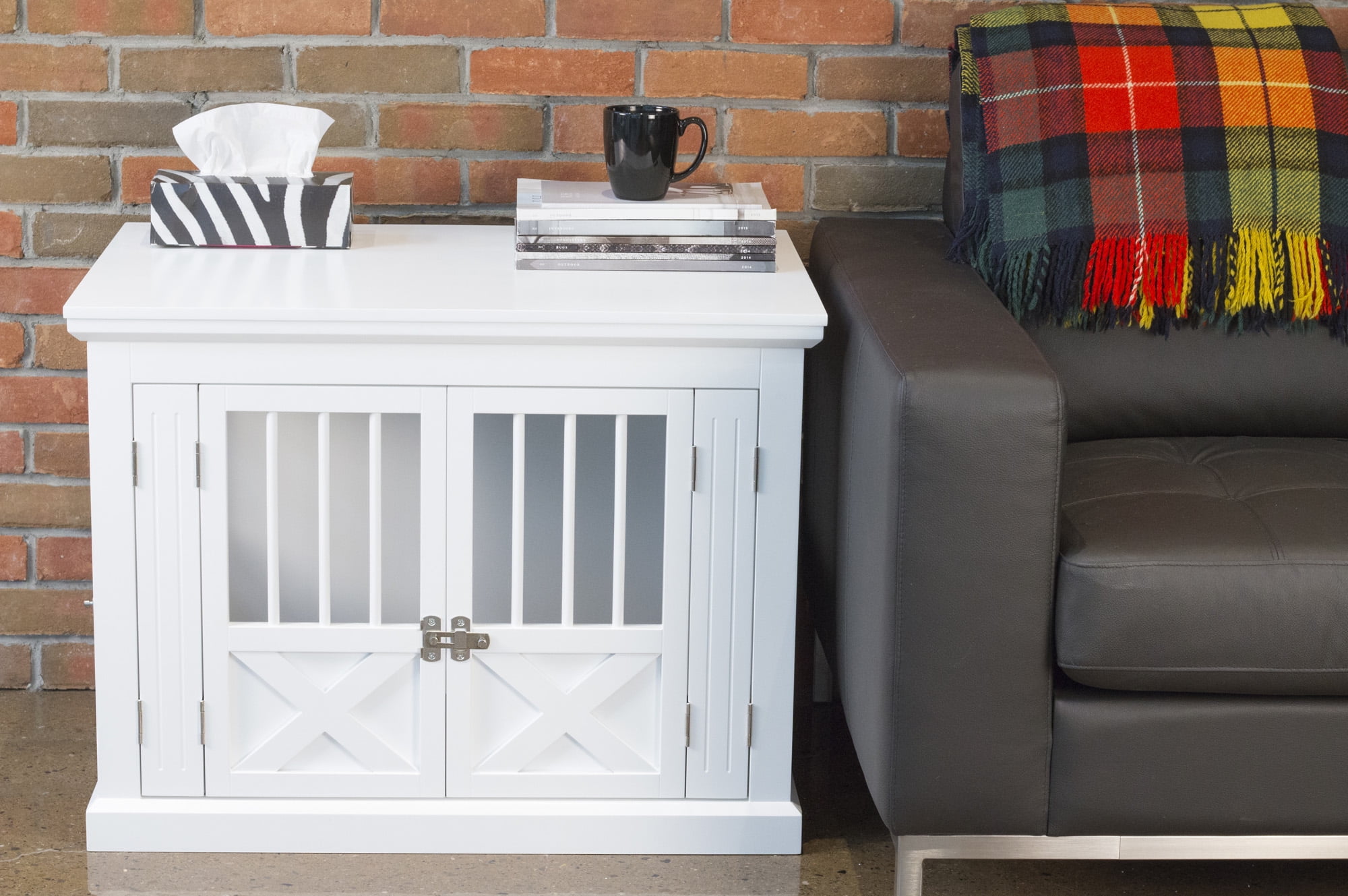 Easy assembly hardware included. Removable tray for easy cleaning. Double hinged front doors for easy opening and closing. Includes 3 doors, 2 front doors, 1 side door. Wooden bars provide enhanced ventilation. Wooden furniture style crate.