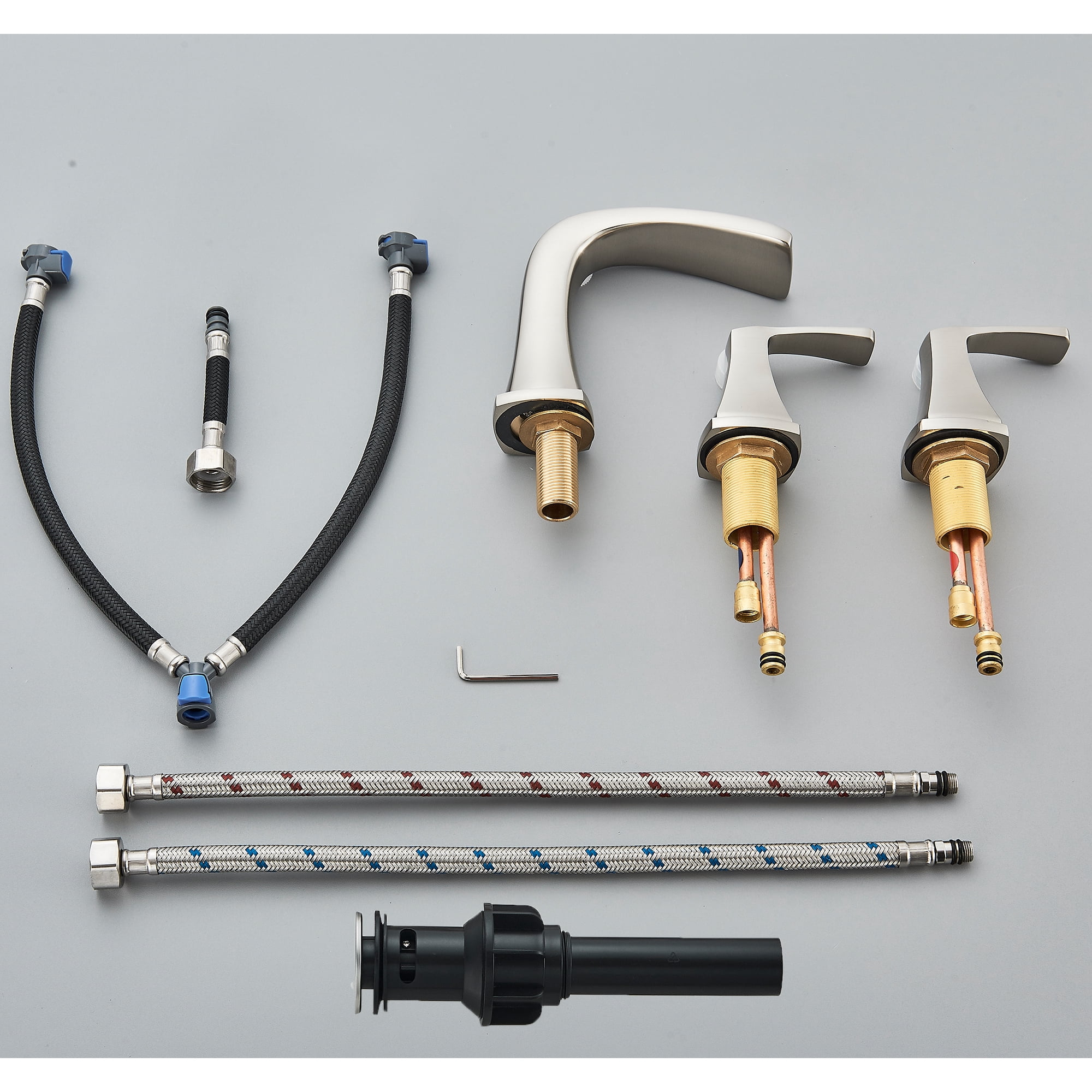 Type:8″ Widespread 3 holes 2 handles bathroom sink faucet Installation:3-hole 8-16in installation Handles Number:2 handles Main Body Material:Brass Handle Material:Zinc Alloy Finish: Brushed Nickel Two Lever Handle :Effortless temperature and flow control Ceramic disc cartridge :Perform up to 60,000 cyles Aerated Spout :Saving More than 30% water Solid Brass Body:For reliability and maximum durability Drain Assembly :Matching finish Pop Up Drain include Superior Finish :Corrosion and Rust-resistant 3/8 US Standard Hose 1*Brand New Faucet 1*Pop up drain with overflow 1* 3/8 inch Hot and Cold Flexible Hoses 1*Set Hardware