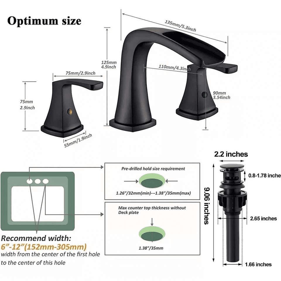 Zovajonia Matte Black 8 “Widespread Bathroom Faucet Basin 3 Hole Waterfall Vanity Sink Mixer Tap