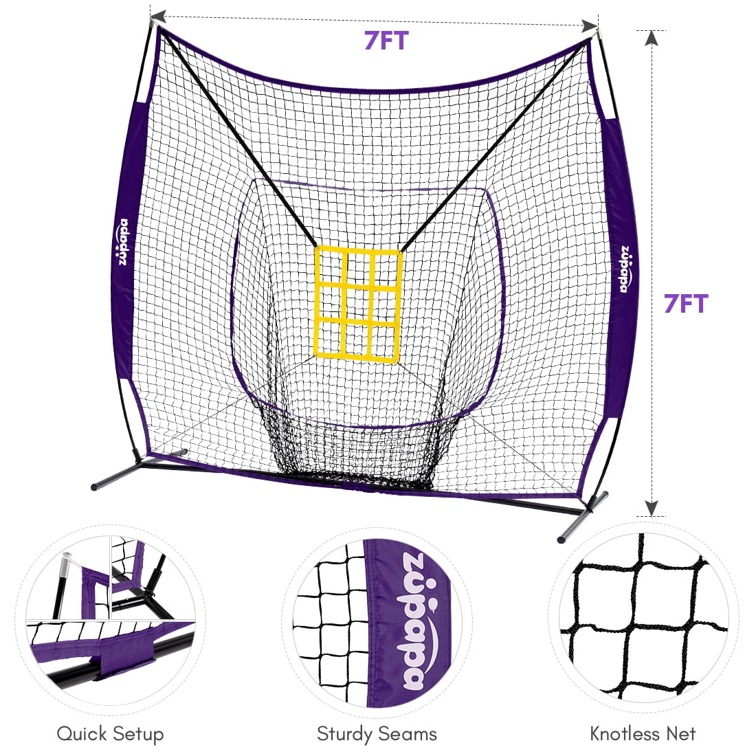 Product Specification – Material: Iron Frame, Nylon net Dimension: 7 x 7 ft Package Content: 1 x Baseball Hitting Net, 1 x Upgraded Yellow Strike Zone Attachmen, 1 x Collapsible Travel Tee, 1 x Ball Caddy, 12 x standard baseballs, 1 x Carry Bag.