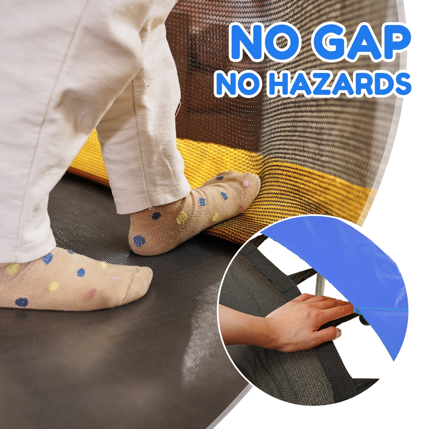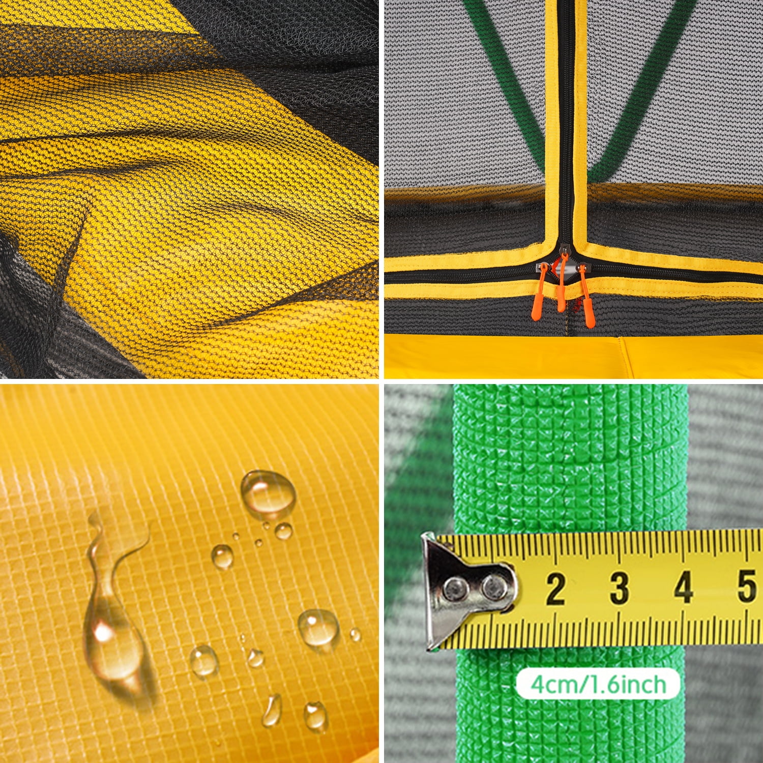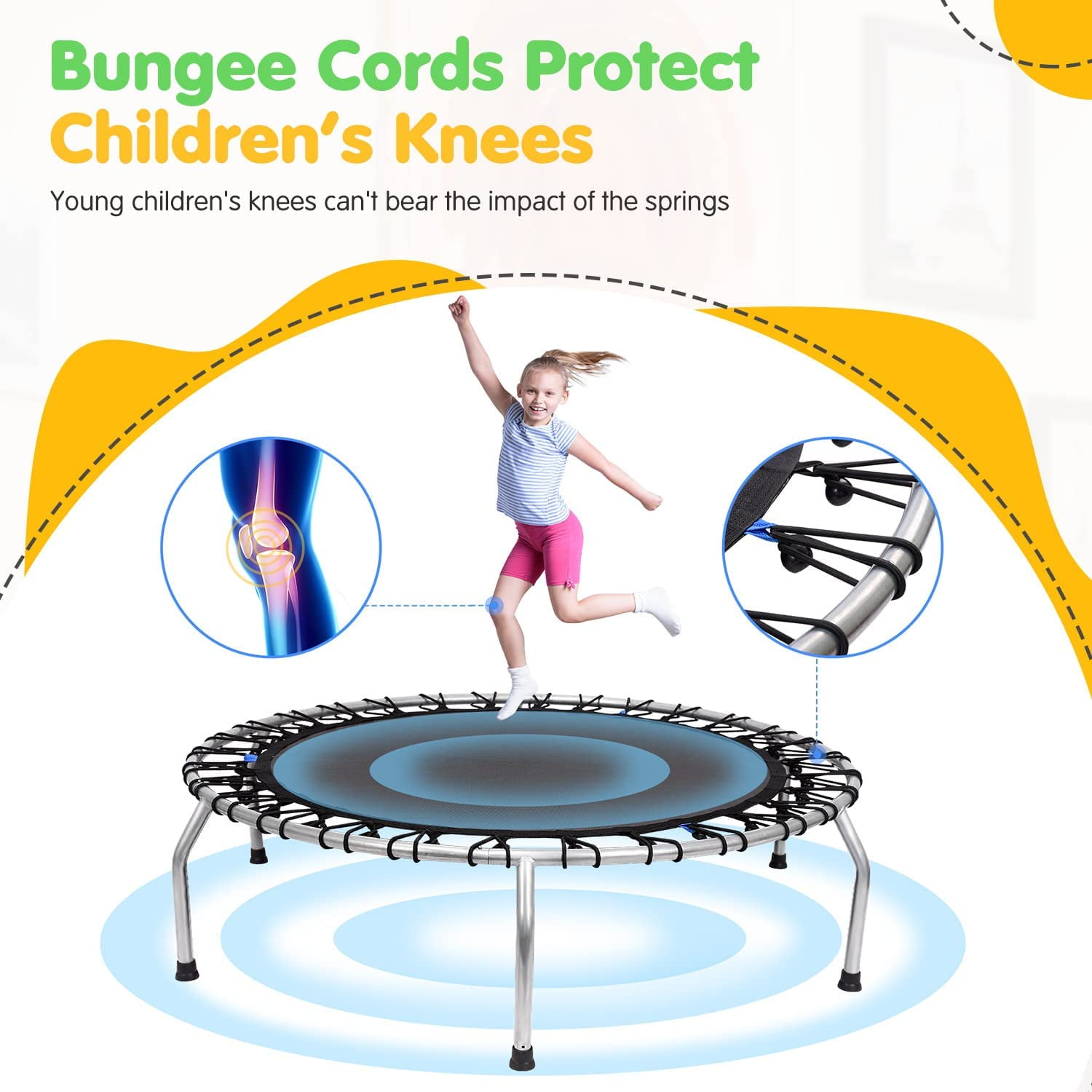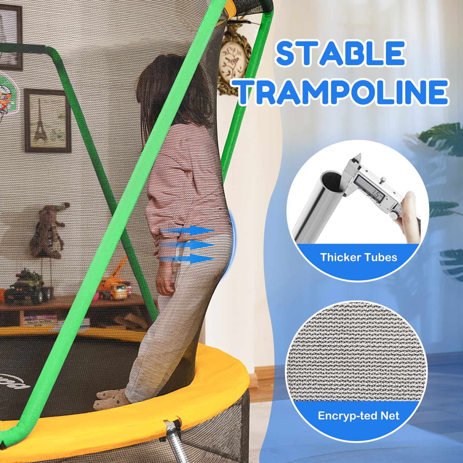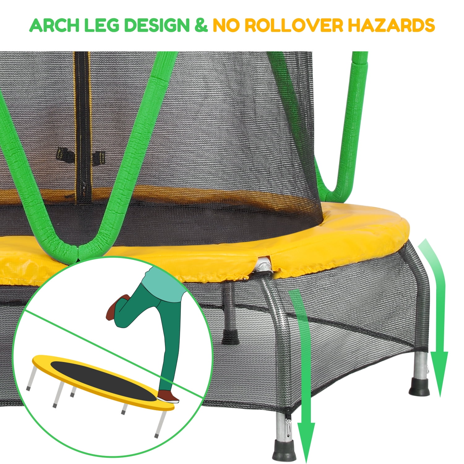 Springless Design Trampoline: Under the thick pad there are not traditional springs but stretch bands which have flexible fiberglass rods that provide the bounce. The potential danger is greatly reduced when the little kids climb on and off it Arched Leg Design and No Rollover: Comparing to straight leg design, the unique arched legs were designed to disperse stress, enhance stability and effectively prevent rollover. The rubber leg caps not only reduce noise but also prevent the trampoline from slipping on the floor Higher Quality and Long Service Life: 1.5mm galvanized rust-proof legs rather than 1.2mm from ordinary. The 15 mm thick yellow pad which made of PE is not easy to tear. Encrypted enclosure net provides more safe protection for kids Safe Design and Fun Exercise: The 47 inch surrounding net ensures your children not to fall off the trampoline or bump into walls. The mini trampoline is perfect for age 2-8.T-shaped zipper is easy to go in and out for children Specification: Product Dimensions: 54″ x 54″ x 59″ Max Weight Capacity: 120lbs/54.40kgJumping Mat Diameter: 41.3 inch Frame: 1.5mm Galvanized tube Product Weight: 27.5lbs Jump mat: PP Safety Net: PE Frame Diameter: 54inch