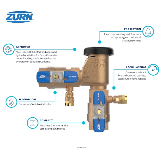The 1 in. Zurn Wilkins 710 Pressure Vacuum Breaker Assembly is one of the most economical and compact PVBs on the market, bringing effortless performance to any residential or commercial irrigation system. It has fewer parts and a lightweight body that’s up to 2 in. shorter than other PVBs, with shared internals between sizes that make contractors’ lives easier. Genuine original manufacturer repair parts ensure your valves maintain certification after repairs. The corrosion-resistant valve and stainless steel shutoff handles make it durable in any weather. Suitable for high-hazard backflow prevention including irrigation. Features a maximum pressure of 150 psi and temperature range of 33°F to 140°F.
