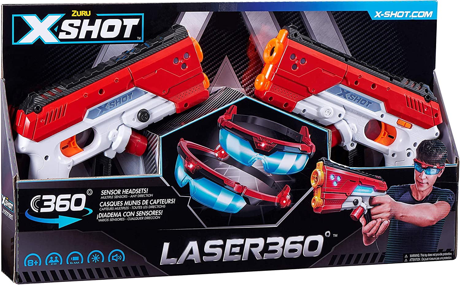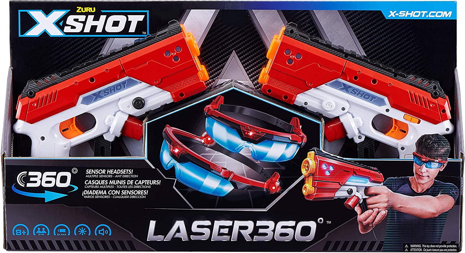 Zuru X-Shot 36280 Laser360 Double Laser Blaster Pack (2 Laser Blasters, 2 Goggles)ULTIMATE LASER EXPERIENCE: Unlike any other laser blaster brand X-Shot Laser360 delivers maximum game-play fun with innovative 360 infrared technology integrated into the goggles.NEXT LEVEL PERFORMANCE: X-Shot Laser360 comes with 2 laser blasters and two 360 goggles. An unlimited number of players can be split in up to 4 teams. Laser blasts can reach up to an incredible 180ft.TRUE INNOVATION: The goggles within the Laser360 packs have three integrated sensors, creating a infrared halo around players, allowing an immersive 360 degree experience. This innovation makes it impossible to cheat during laser battles, and make the laser blaster experience as realistic as possible.