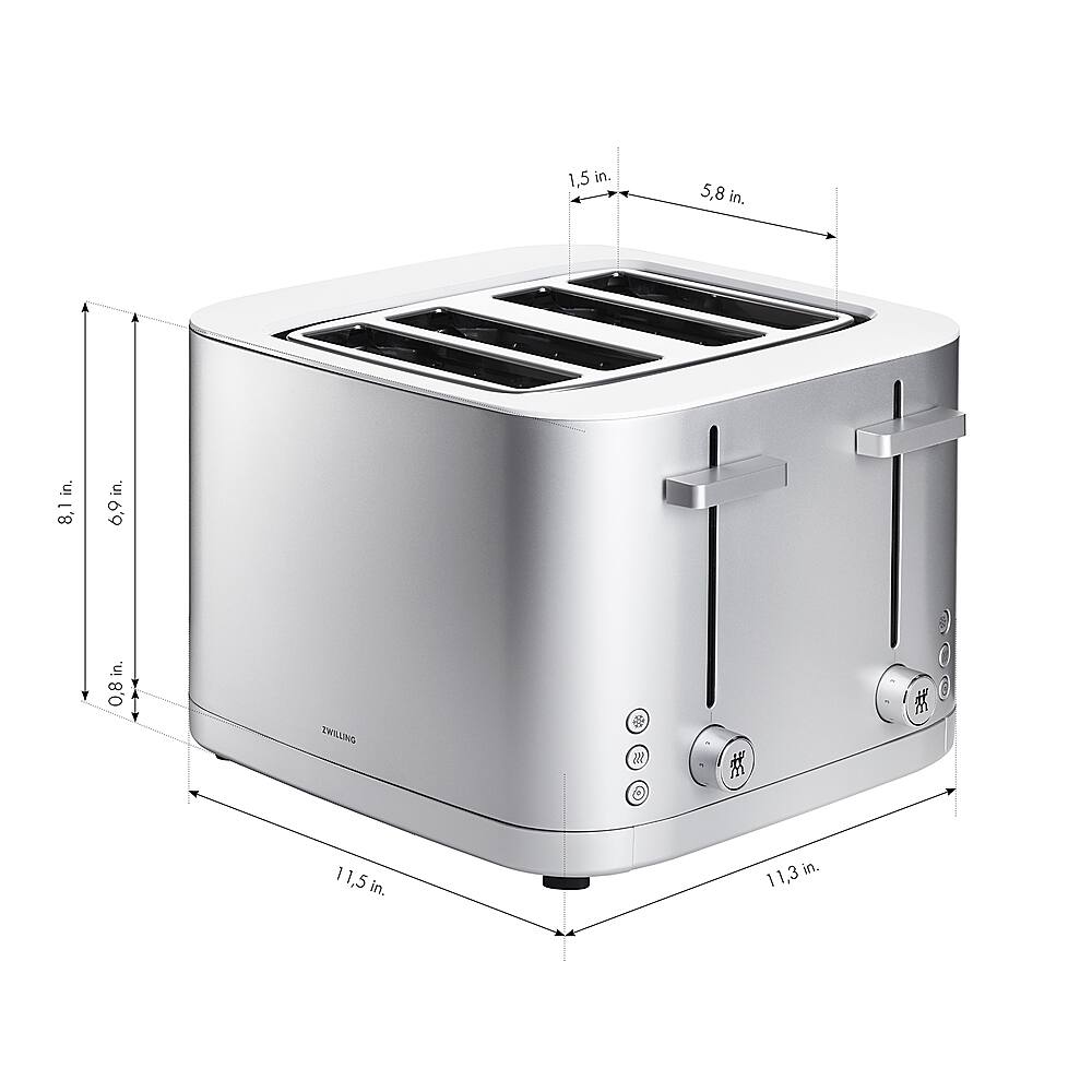 The 4-slot ZWILLING toaster ensures evenly browned toast, bagels, muffins, and more, every time you use it. Eight separate heating elements and balanced heat distribution ensure that every slice of bread is evenly toasted on both sides, even after repeated toasting. The result: toast that’s crispy on the outside and soft on the inside. And when it’s finished, toast doesn’t fly out of the toaster. The soft-lift feature ensures it gently glides up and the built-in extra-lift allows even smaller slices to be removed safely. Clean up is a cinch. Crumbs end up in the crumb drawer that slides out for easy removal. Like all Enfinigy products, the 4-slot toaster offers a free downloadable app. The ZWILLING Culinary World App QR code on the product packaging fires up the app so you can search a database of original recipes.
