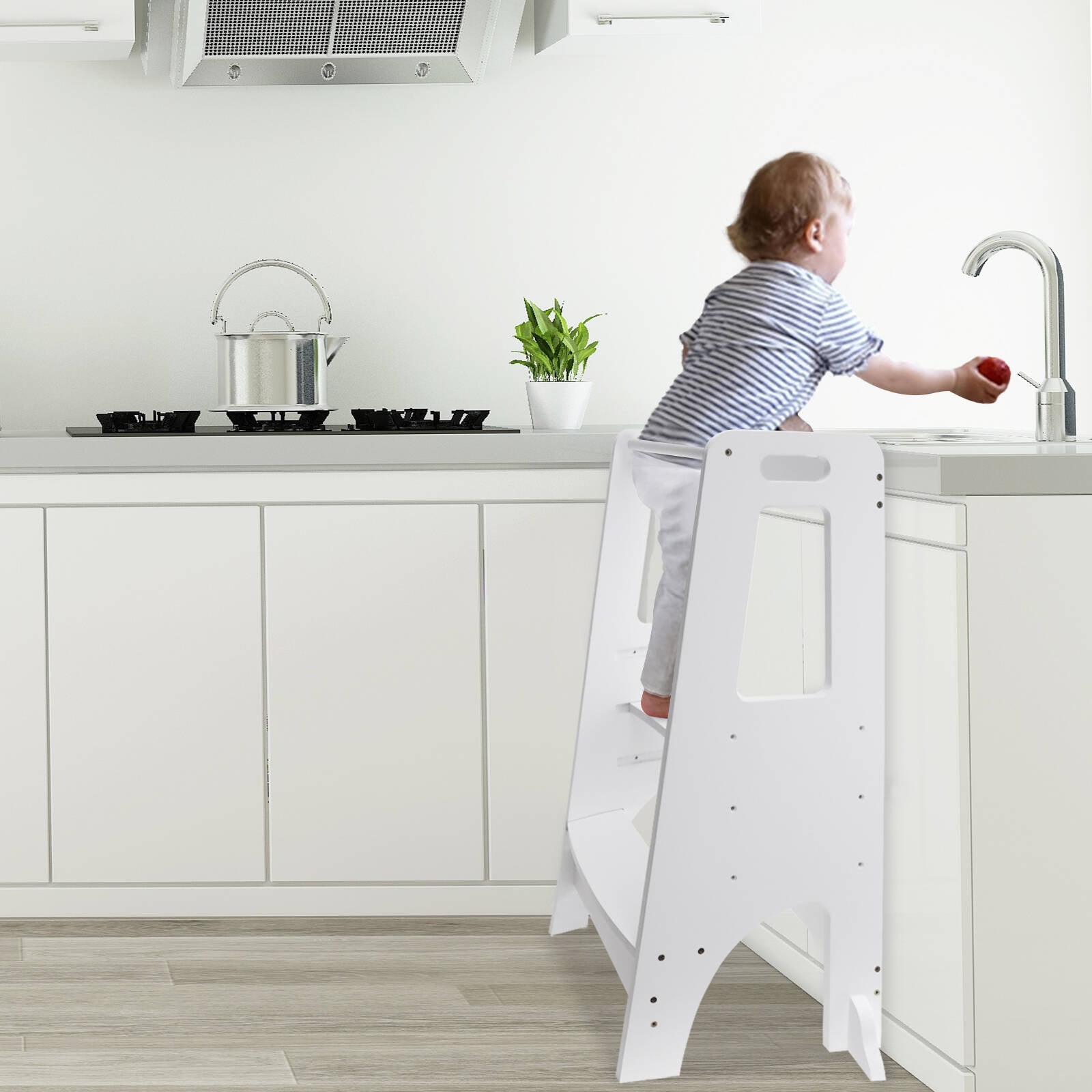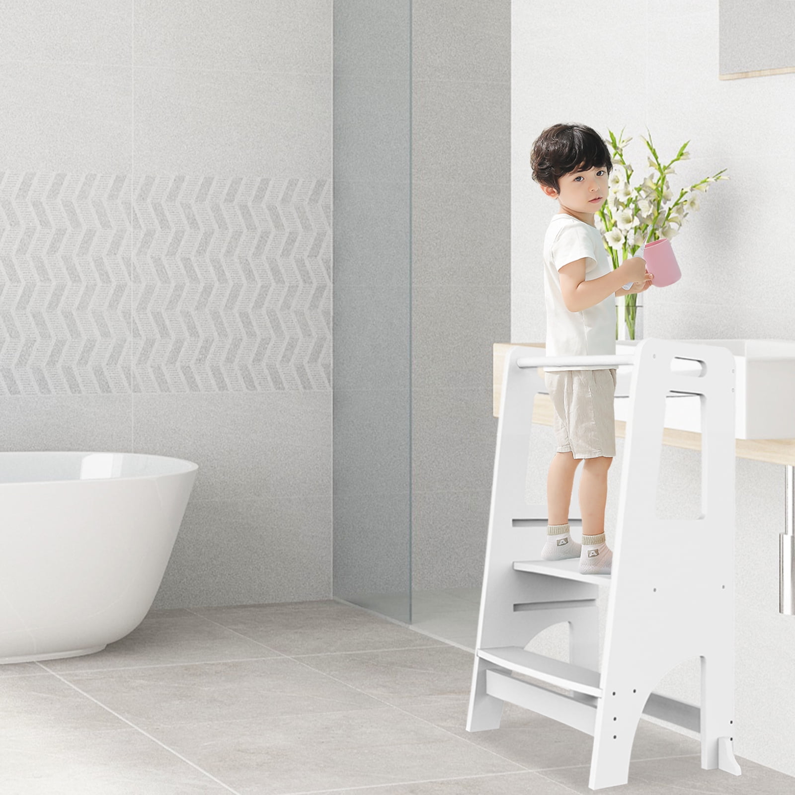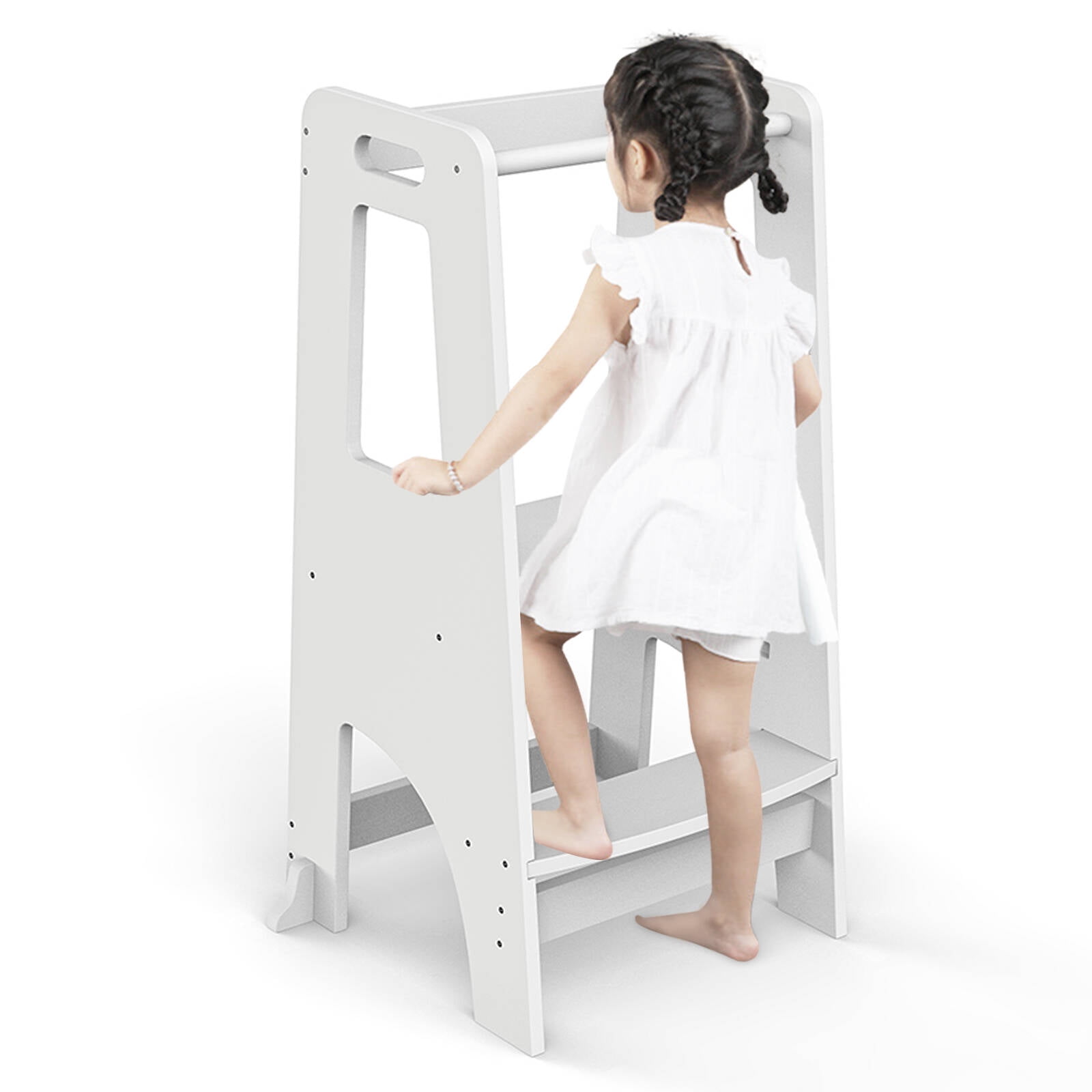 ZZBIQS Wooden Cooking Step Stool for Kids,Adjustable Height,Kids Step Ladder Stool Safety Bar Helper,White